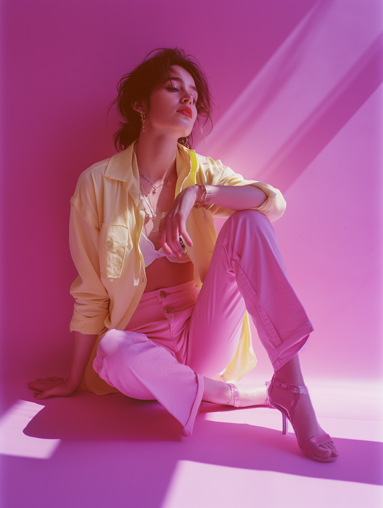 Woman in yellow shirt and pink pants sits against a pink background, exuding a relaxed vibe with closed eyes and stylish accessories.
