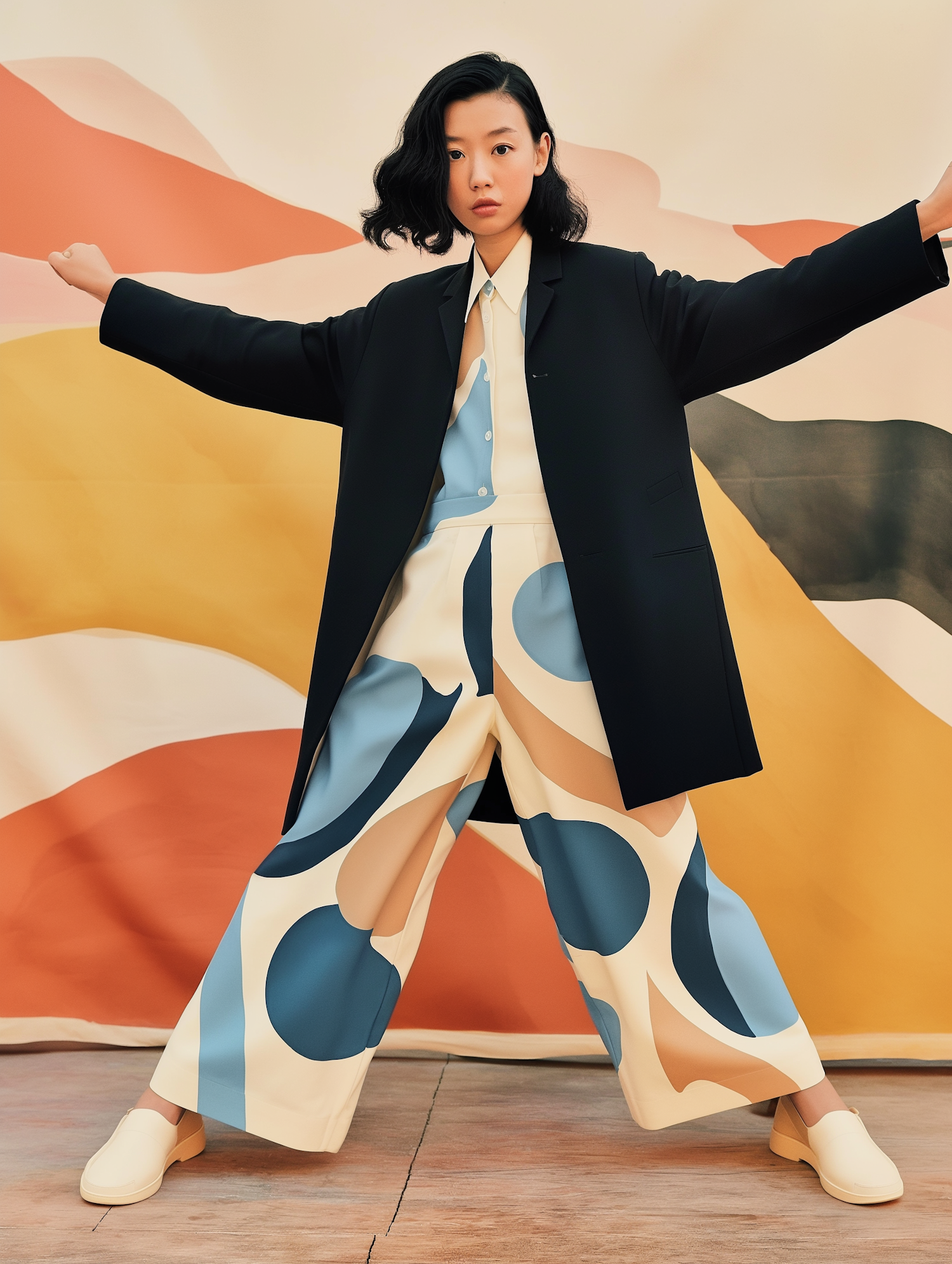 Asian woman in bold patterned outfit and black coat poses against colorful abstract mural.