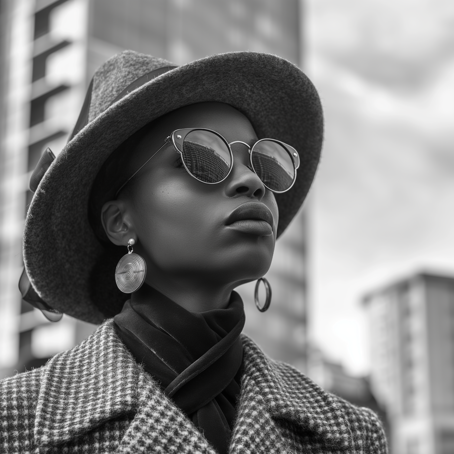 Stylish Black woman in a hat and sunglasses, exuding confidence in an urban setting. Black and white portrait with elegant fashion details.