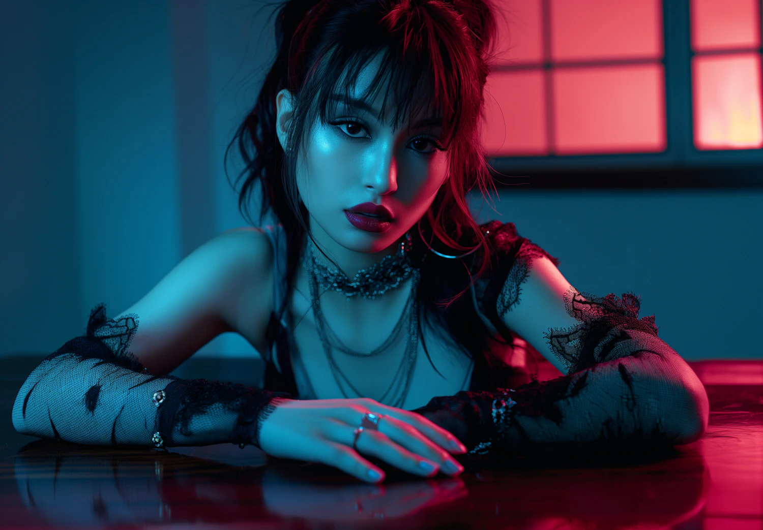 Moody portrait of a woman with dramatic makeup and lace attire, set against a blue and red-lit background.