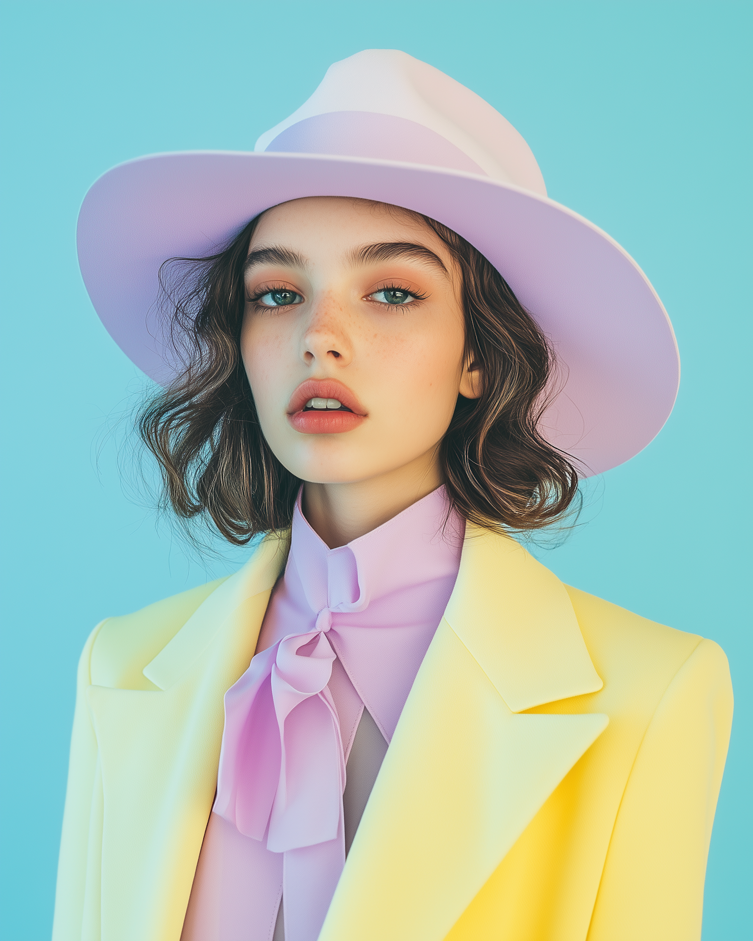 Stylish woman in pastel outfit with lavender hat and yellow blazer against a blue background, exuding elegance and modern fashion.