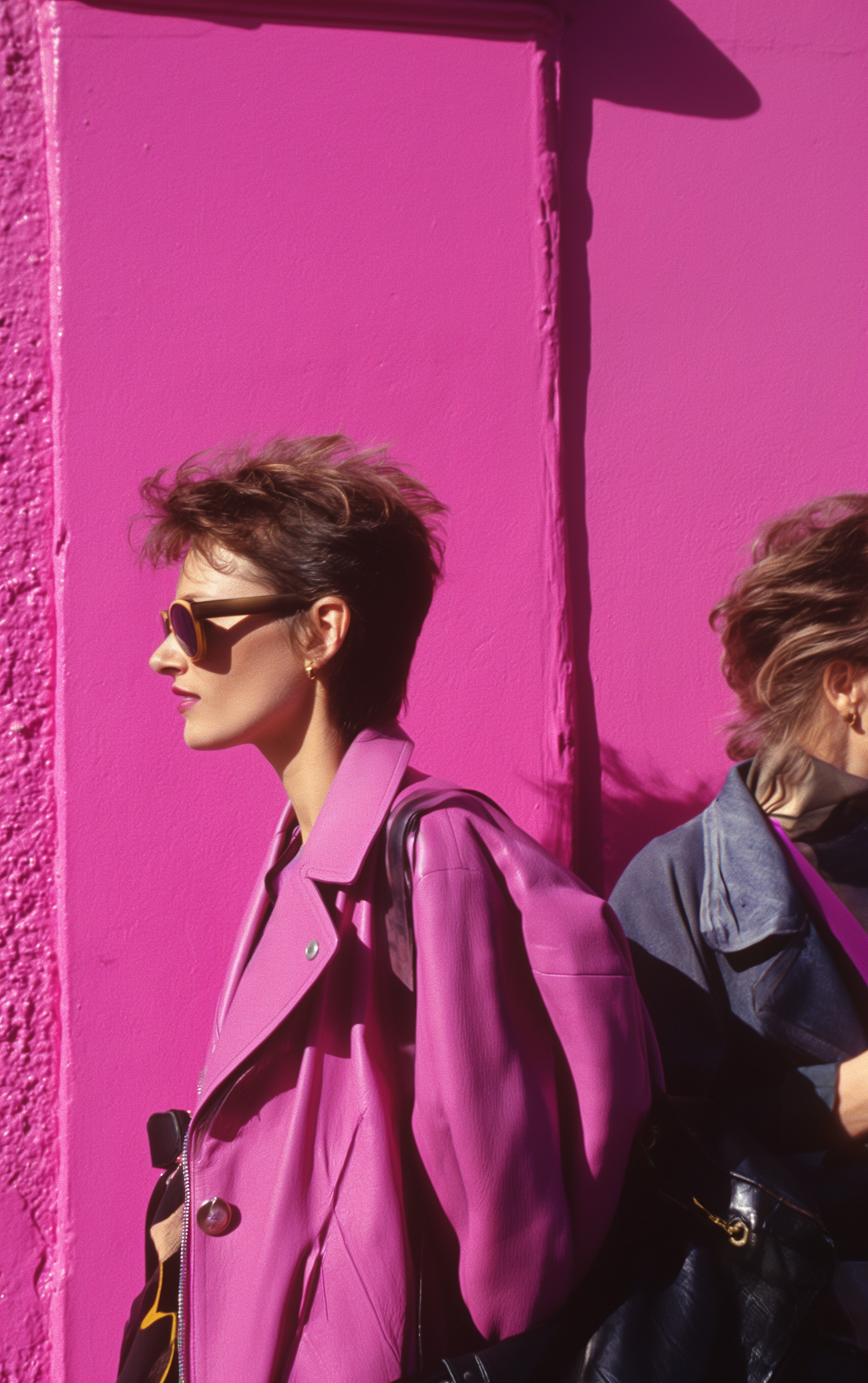 Stylish woman in magenta leather jacket and sunglasses against a vibrant pink wall, exuding retro-chic vibes in bright sunlight.