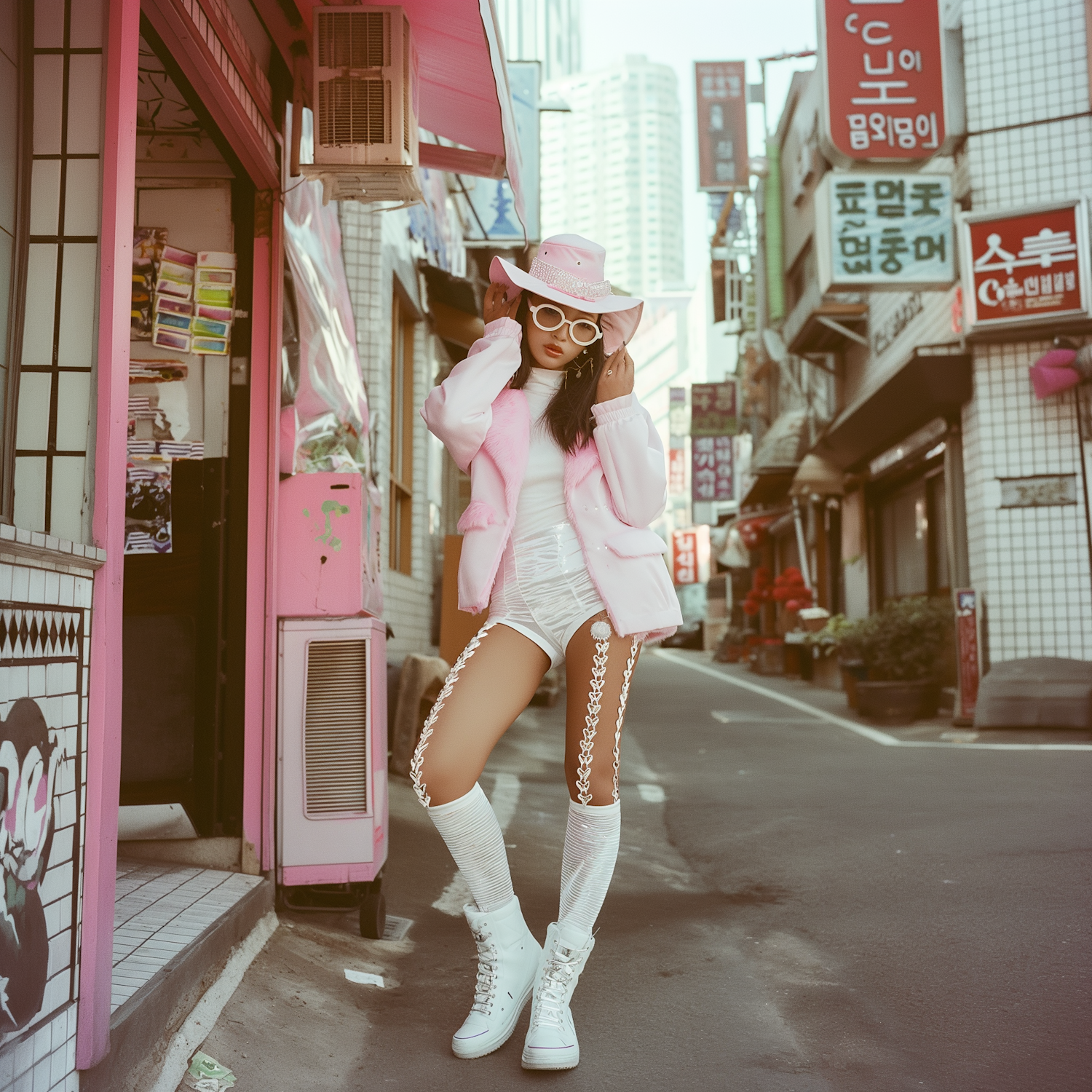 Stylish woman in pink cowboy hat and jacket poses in a Korean street, wearing white shorts and boots, surrounded by urban architecture.