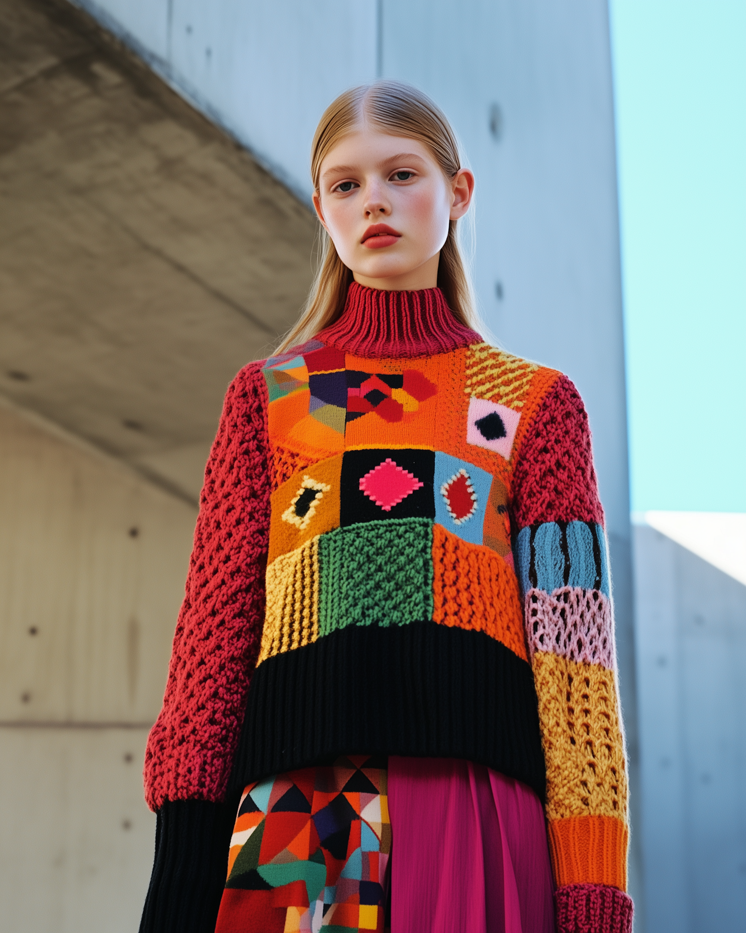 Young woman in a colorful geometric sweater and skirt against a modern architectural backdrop.