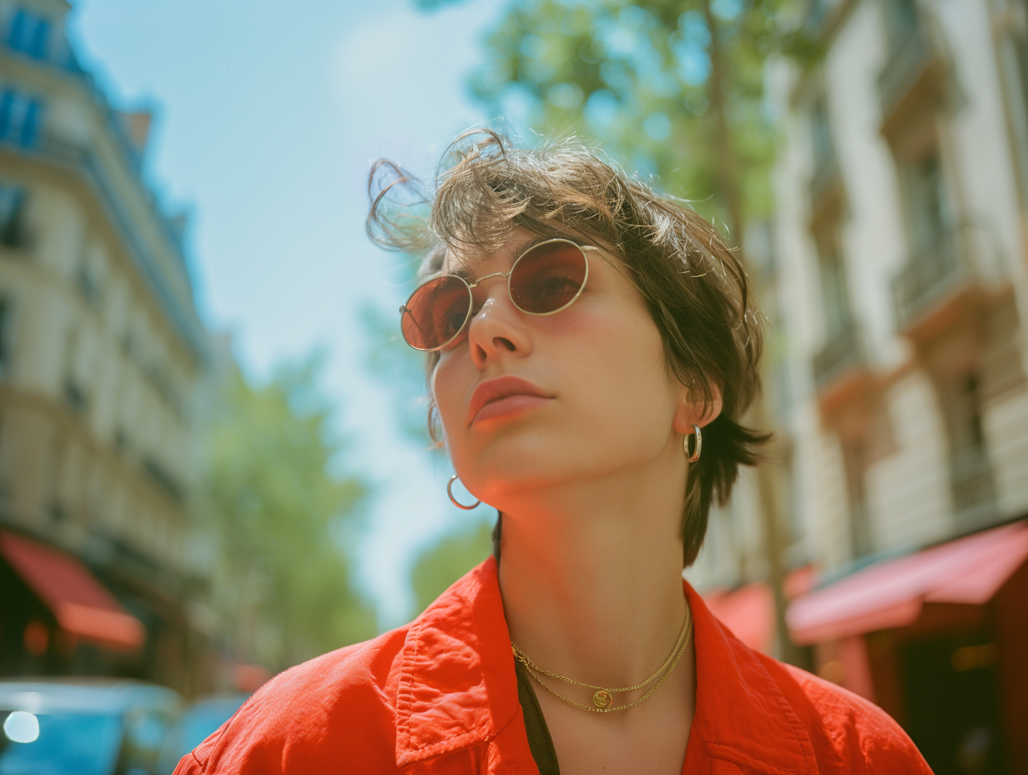 Stylish woman in red jacket and sunglasses in a sunlit city street, exuding a retro vibe with gold accessories.