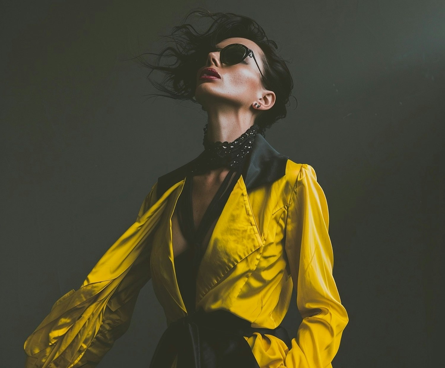 Stylish woman in a yellow coat with black lapels, wearing sunglasses and red lipstick, exudes confidence and sophistication.