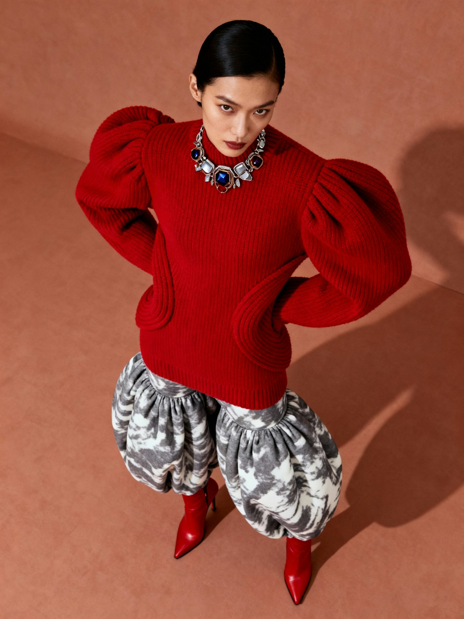 A stylish woman in a red sweater with puffed sleeves, patterned pants, and red boots, accessorized with a bold necklace.