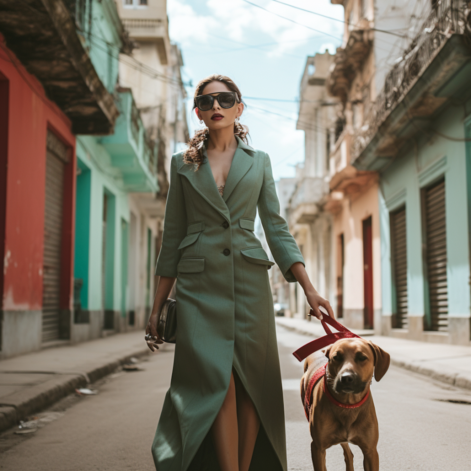 Stylish woman in green coat walking dog on vibrant street with colorful buildings and clear sky.
