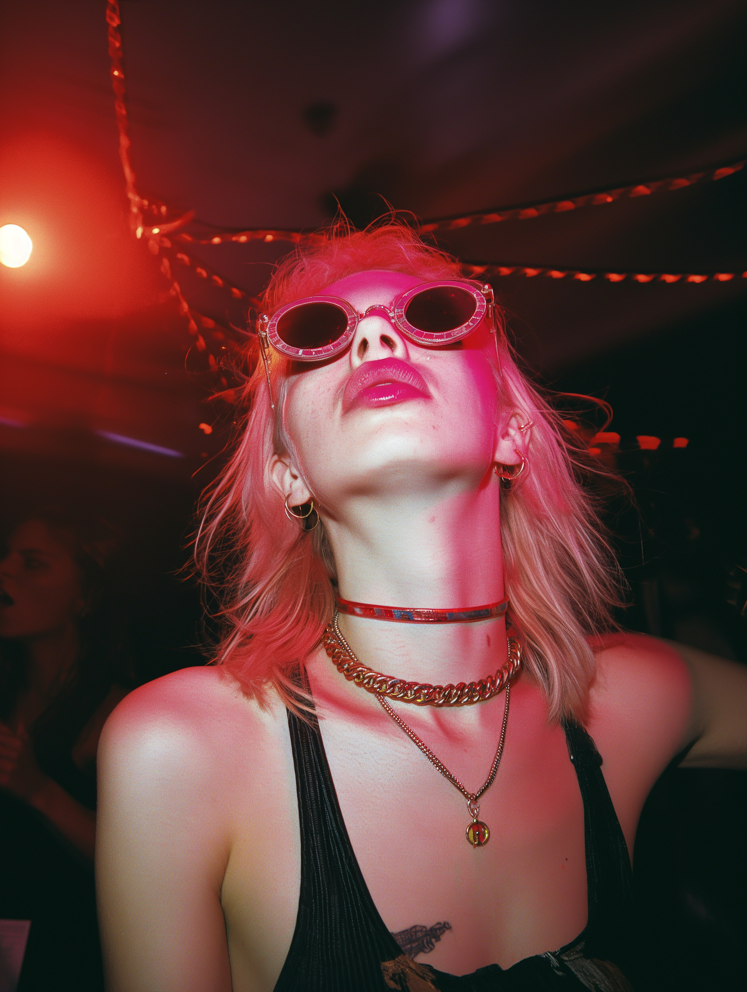 Vibrant party scene with a stylish woman in pink sunglasses and bold jewelry, set against dramatic red lighting.