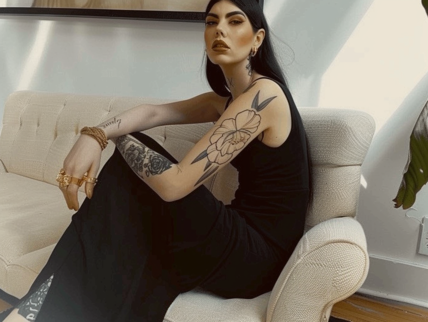 Woman with tattoos and black dress sitting on a sofa, exuding confidence and style in a minimalist setting.
