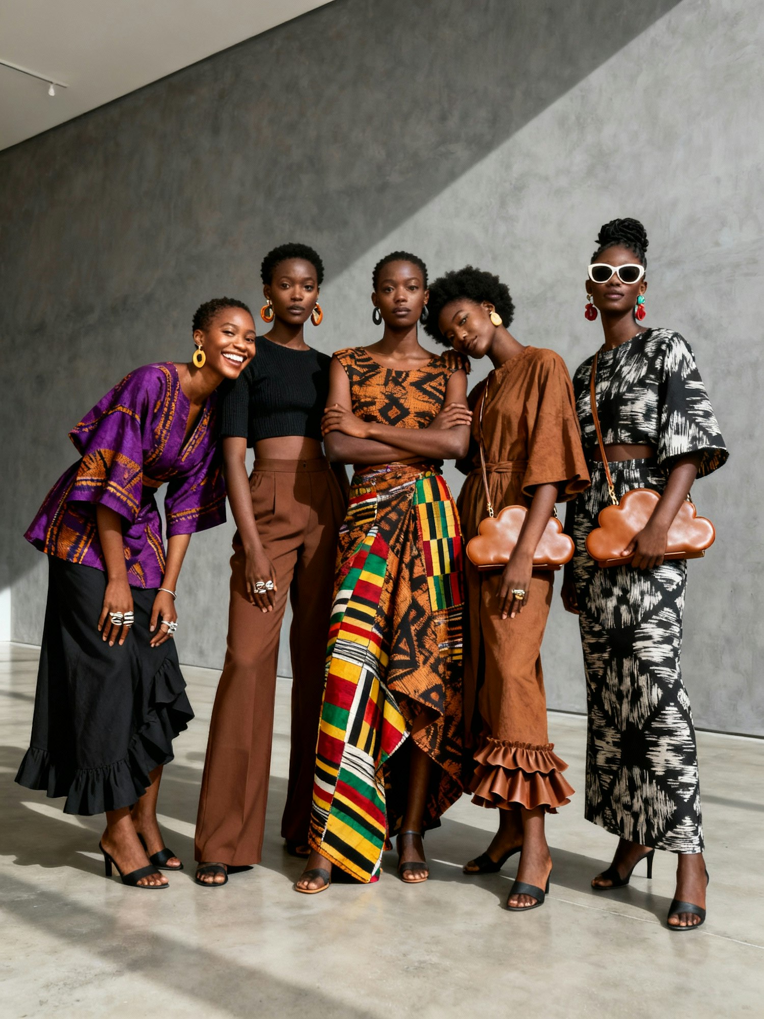 all-frame, full-body, high-definition studio portrait of five stylish Black friends standing closely together in a minimalist indoor setting. The backdrop is a smooth, textured gray wall with a clean concrete floor, creating a sculptural, gallery-like atmosphere. The vertical composition emphasizes height, posture, and textile flow—ideal for editorial storytelling and fashion-forward framing. Styling & Fashion: Each individual wears a unique outfit from a coordinated Afrocentric fashion collection—featuring bold textile patterns inspired by traditional African dyeing techniques such as batik, kente, or mud cloth. Garments include structured kaftans, cropped tops, wide-legged trousers, layered tunics, and asymmetrical skirts. Color palettes span jewel tones, earth tones, and monochrome contrasts, creating visual rhythm and individuality within the group. Accessories include sculptural earrings, stacked rings, sunglasses, and soft leather clutch bags with asymmetrical ruffles resembling clouds, carried with editorial flair. Pose & Expression: One person leans slightly forward with a radiant smile, adding spontaneity and emotional warmth. Another stands tall with arms crossed and a direct gaze, exuding quiet confidence. A third tilts their head playfully, while the others strike relaxed, expressive stances that suggest camaraderie and shared style. Their body language reflects familiarity, pride, and editorial flair—like a fashion collective or creative crew. Setting & Mood: The studio setting features soft, directional lighting that casts gentle shadows and highlights the textures of the garments, accessories, and hairstyles. The tall vertical frame captures the full silhouettes of each individual, emphasizing posture, textile movement, and group dynamics. The overall mood is sculptural, expressive, and culturally rich—ideal for a fashion editorial or visual archive celebrating Afrocentric style, friendship, and creative identity.
