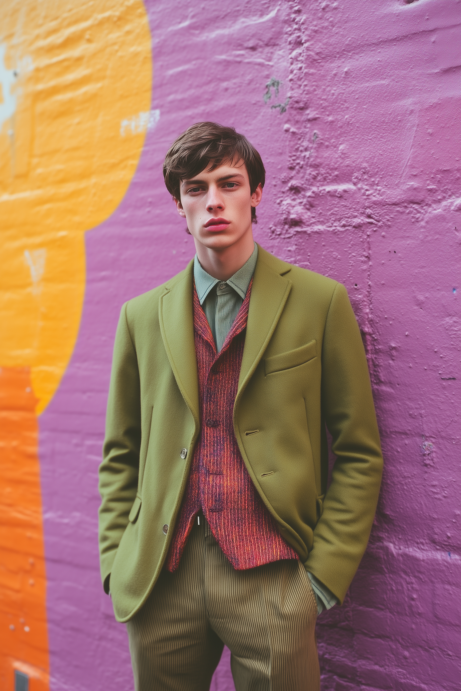 Stylish young man in an olive blazer and textured vest against a vibrant purple and orange wall, exuding modern fashion vibes.