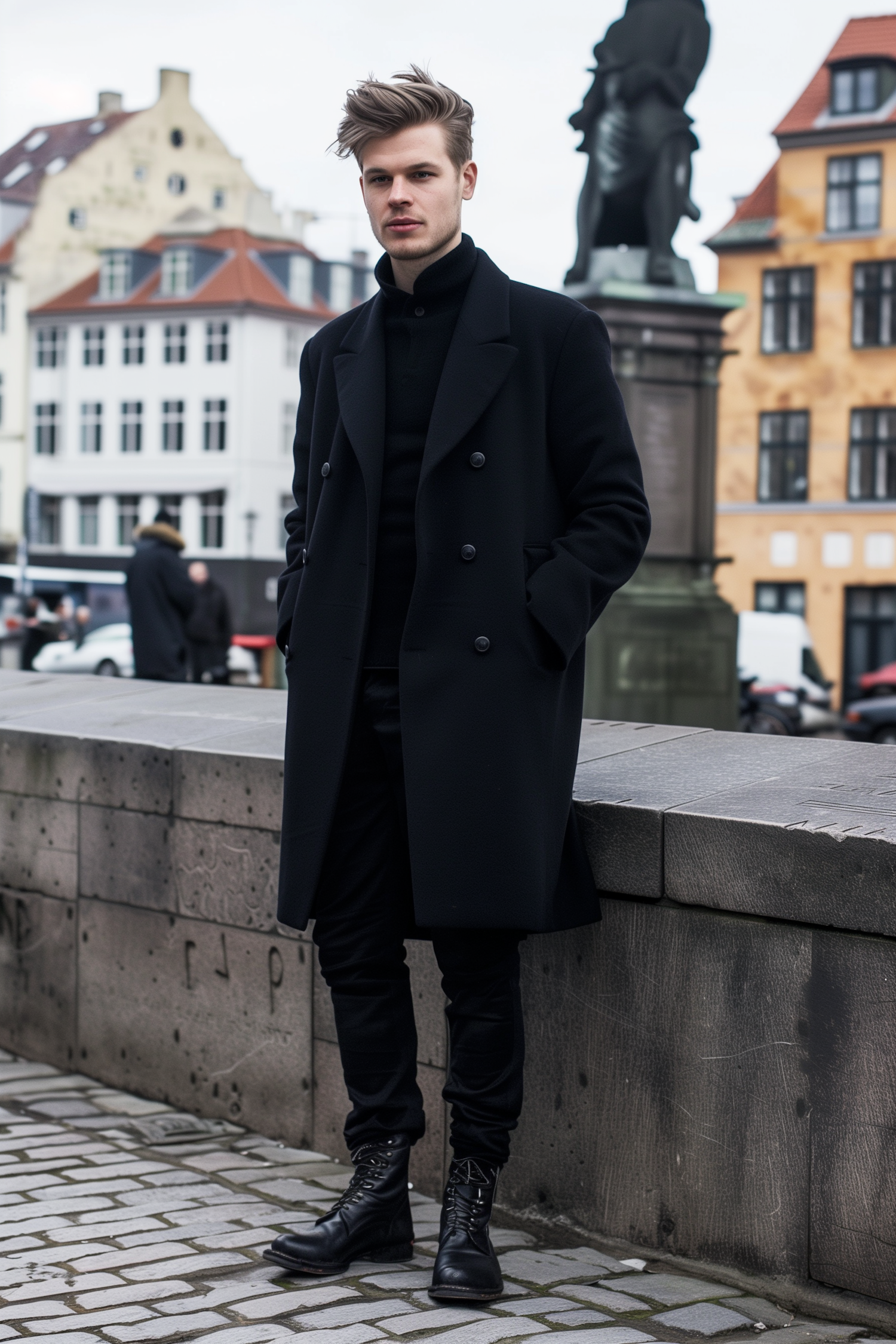 Stylish man in black coat and boots stands in a European city square, exuding modern fashion and sophistication.