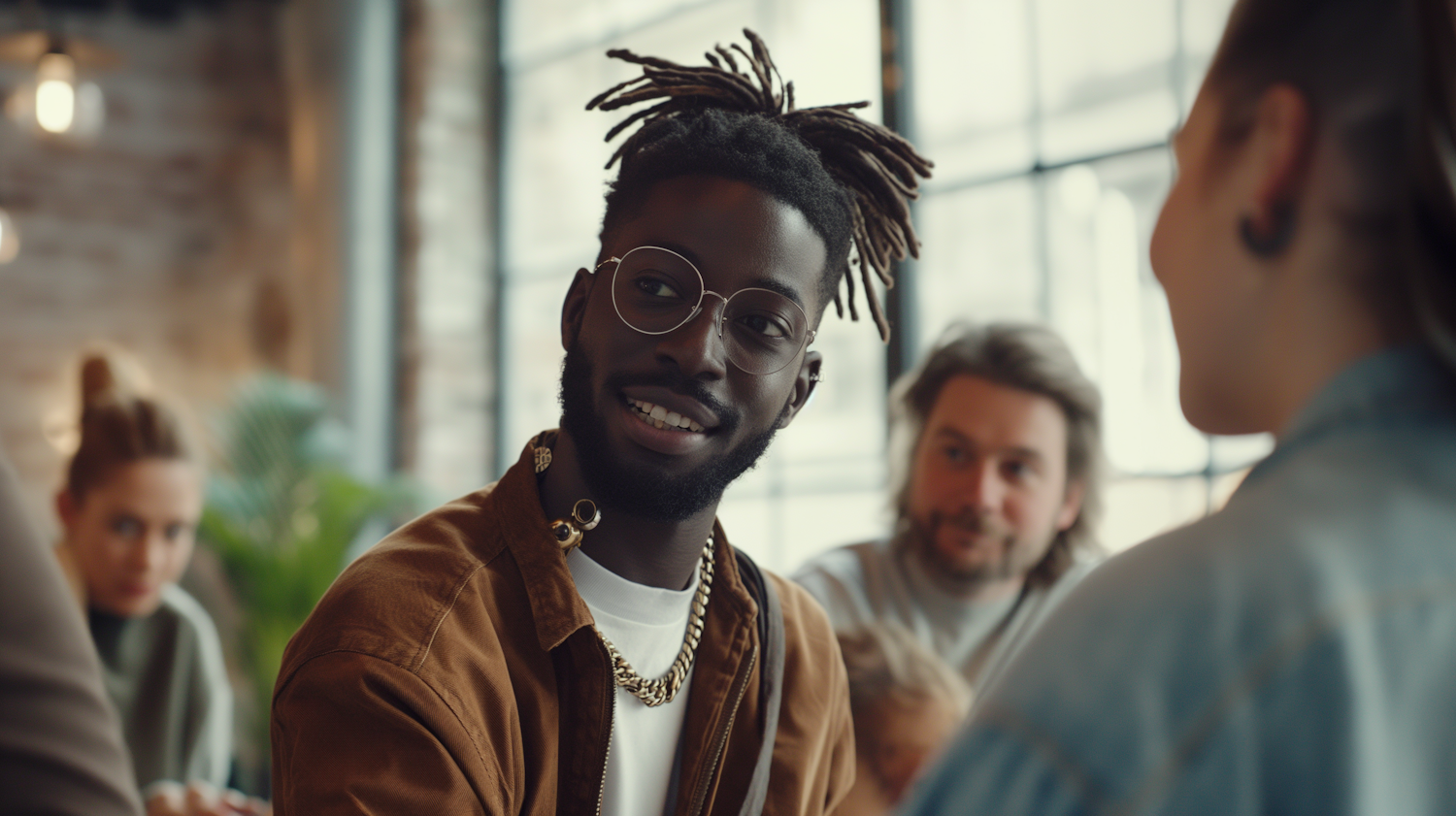A stylish young man with dreadlocks and glasses smiles in a cozy social setting, engaging with friends in a well-lit room.