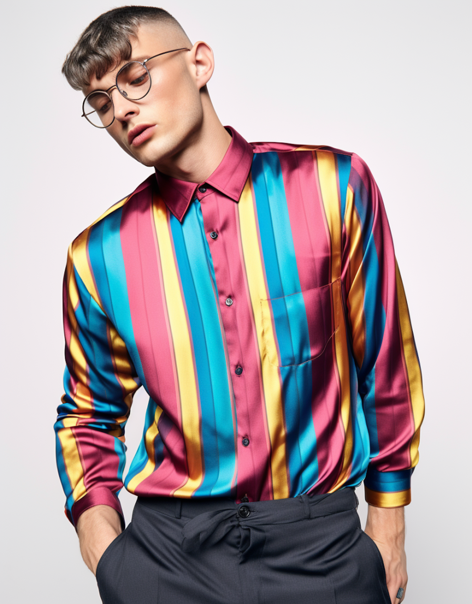 Stylish young man in vibrant striped shirt and glasses, posing with a neutral expression against a plain background.