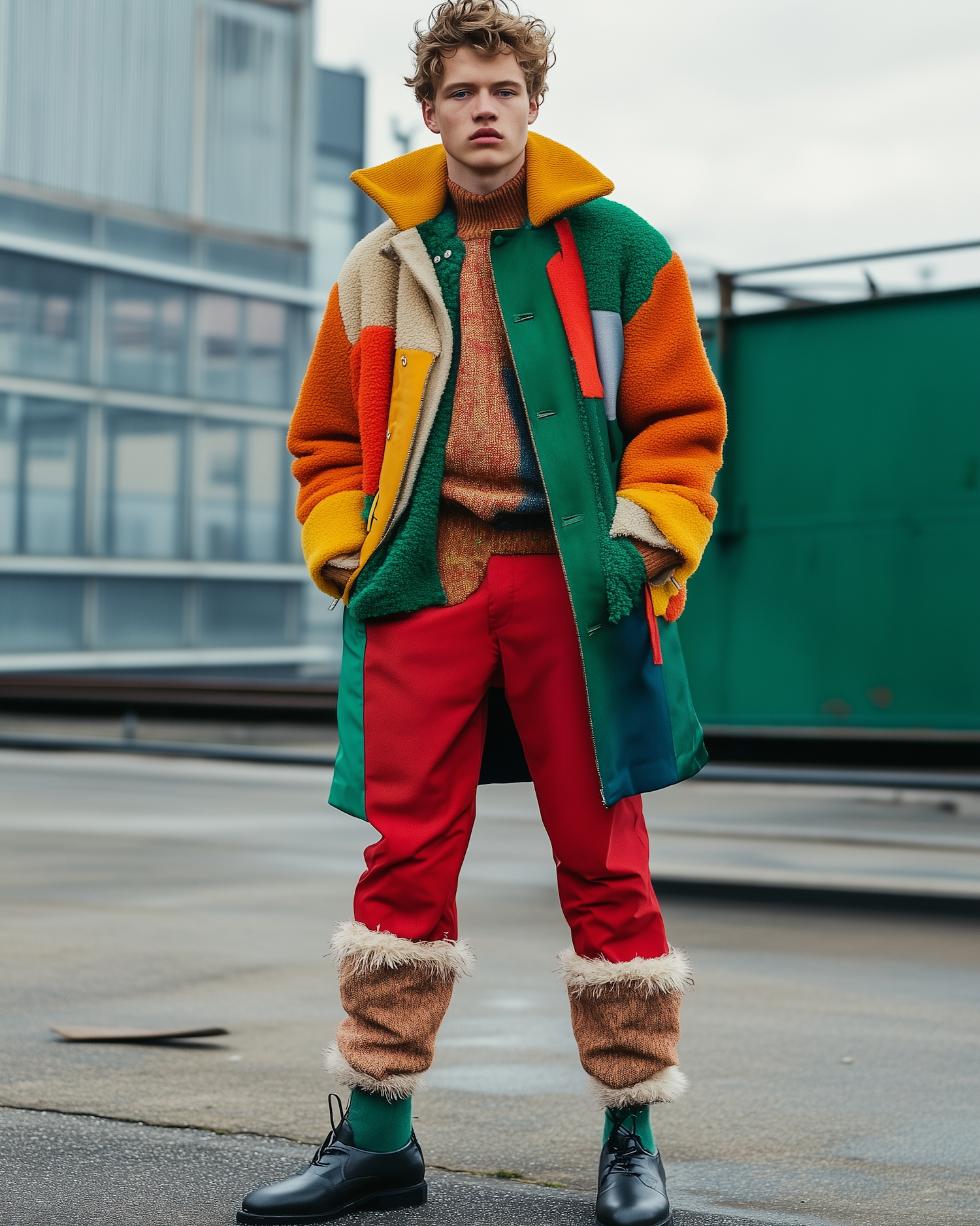 Young man in colorful, eclectic fashion with a multicolored coat and red pants, standing in an urban setting.