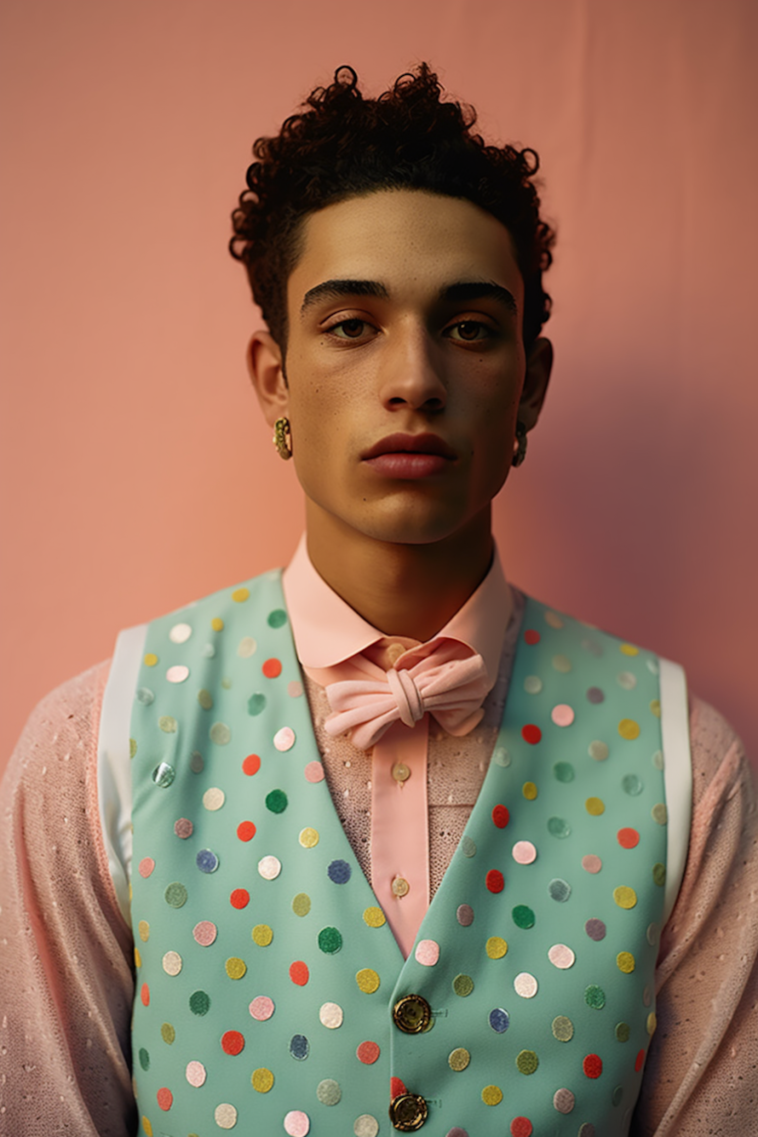 Young man in pastel pink shirt and turquoise polka dot vest, standing against a pink background. Stylish and colorful fashion.