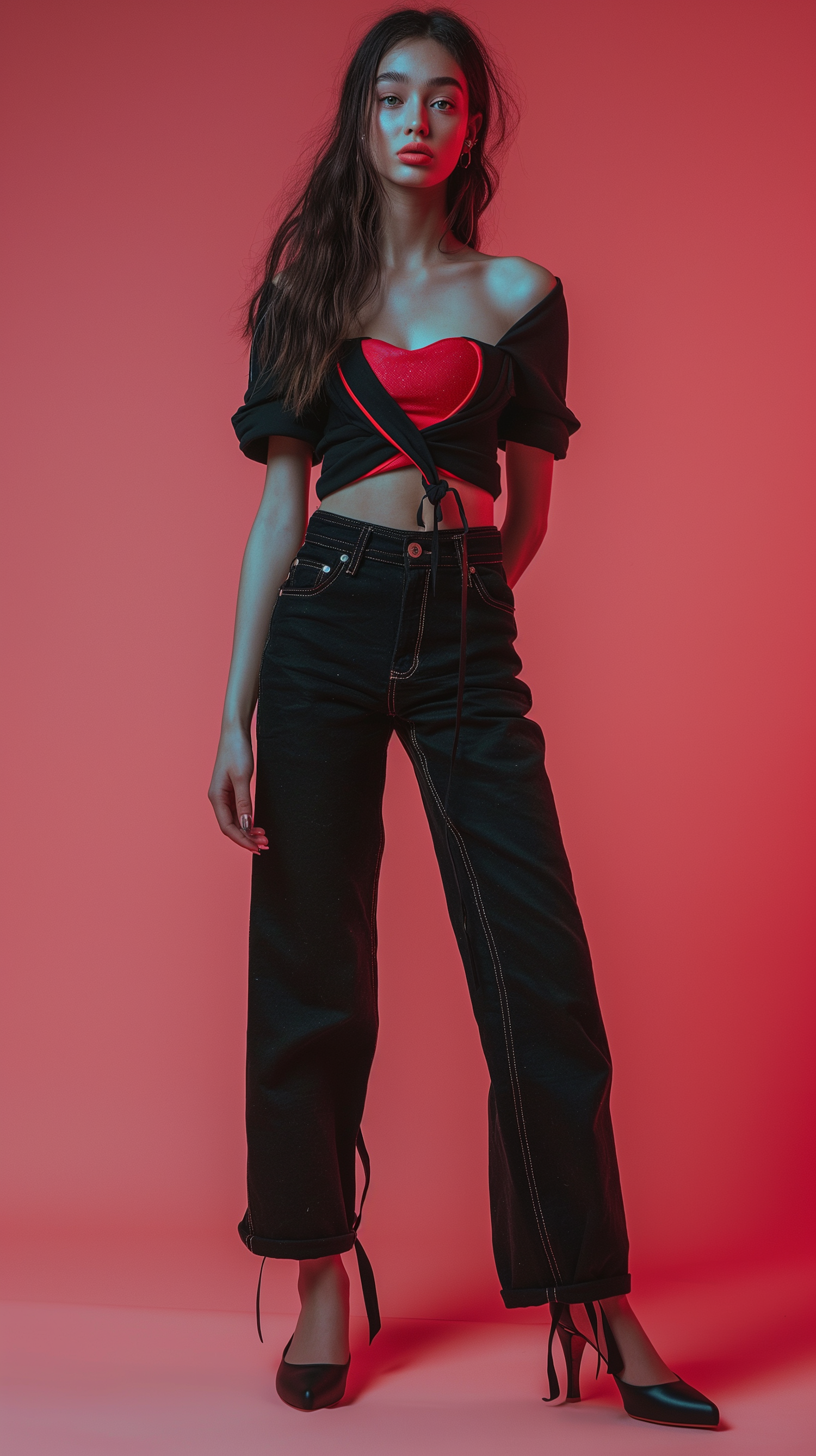 Stylish woman in black and red outfit poses confidently against a vibrant red background, exuding modern fashion vibes.