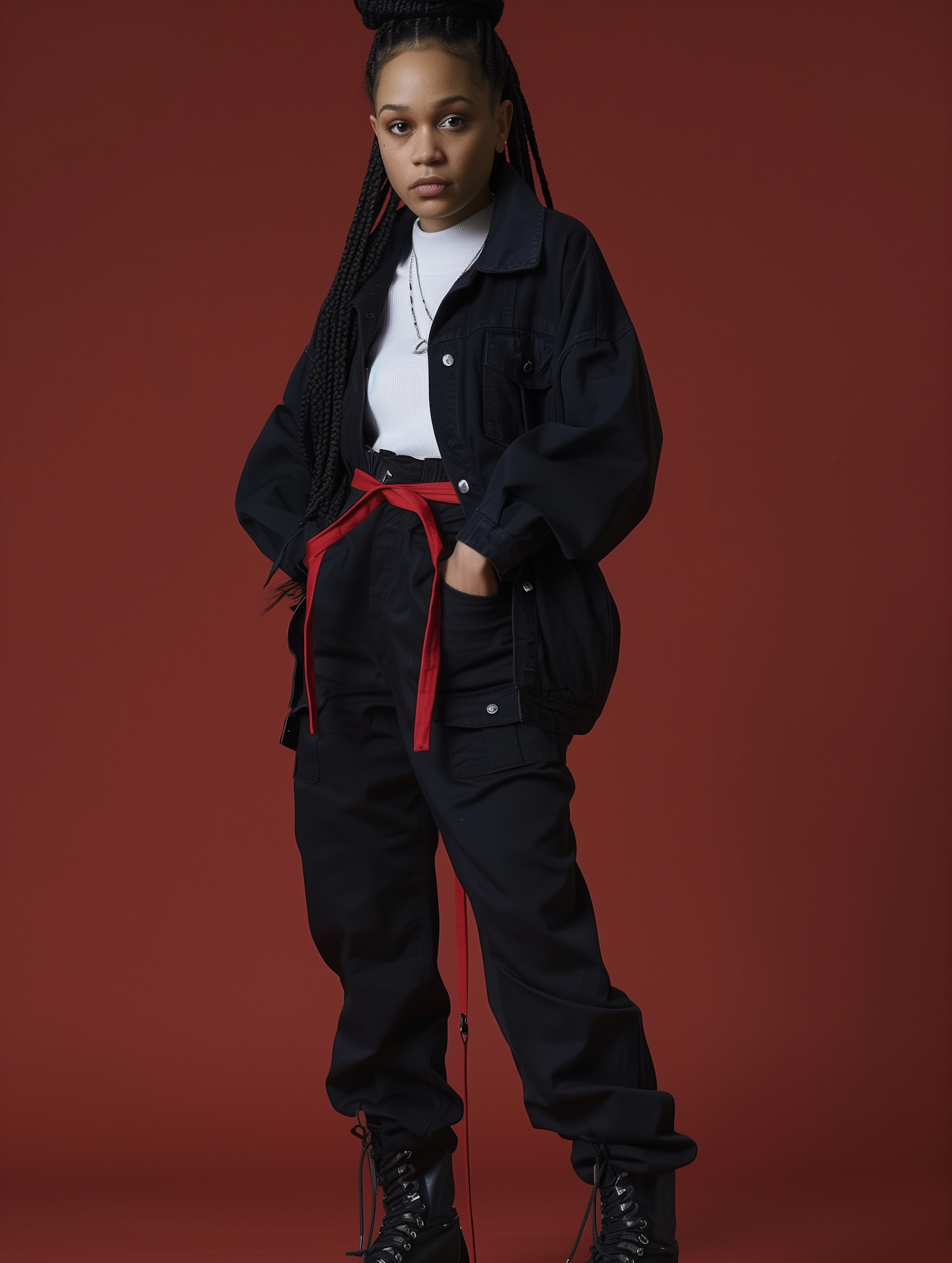 Stylish young woman in black outfit with red belt, standing confidently against a dark red background.