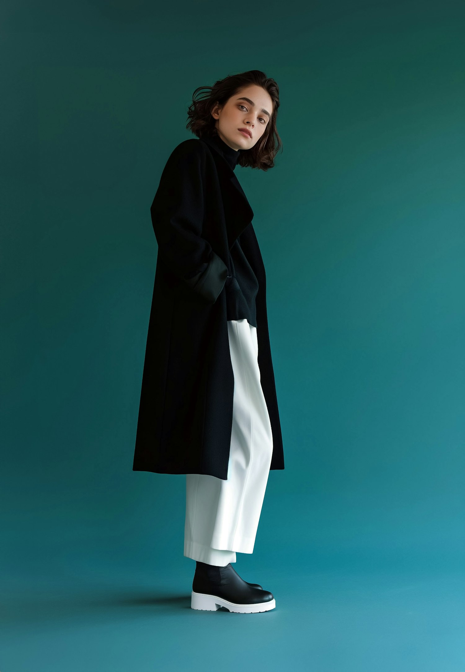 Stylish woman in black coat and white pants against a teal background, exuding modern elegance and minimalism.