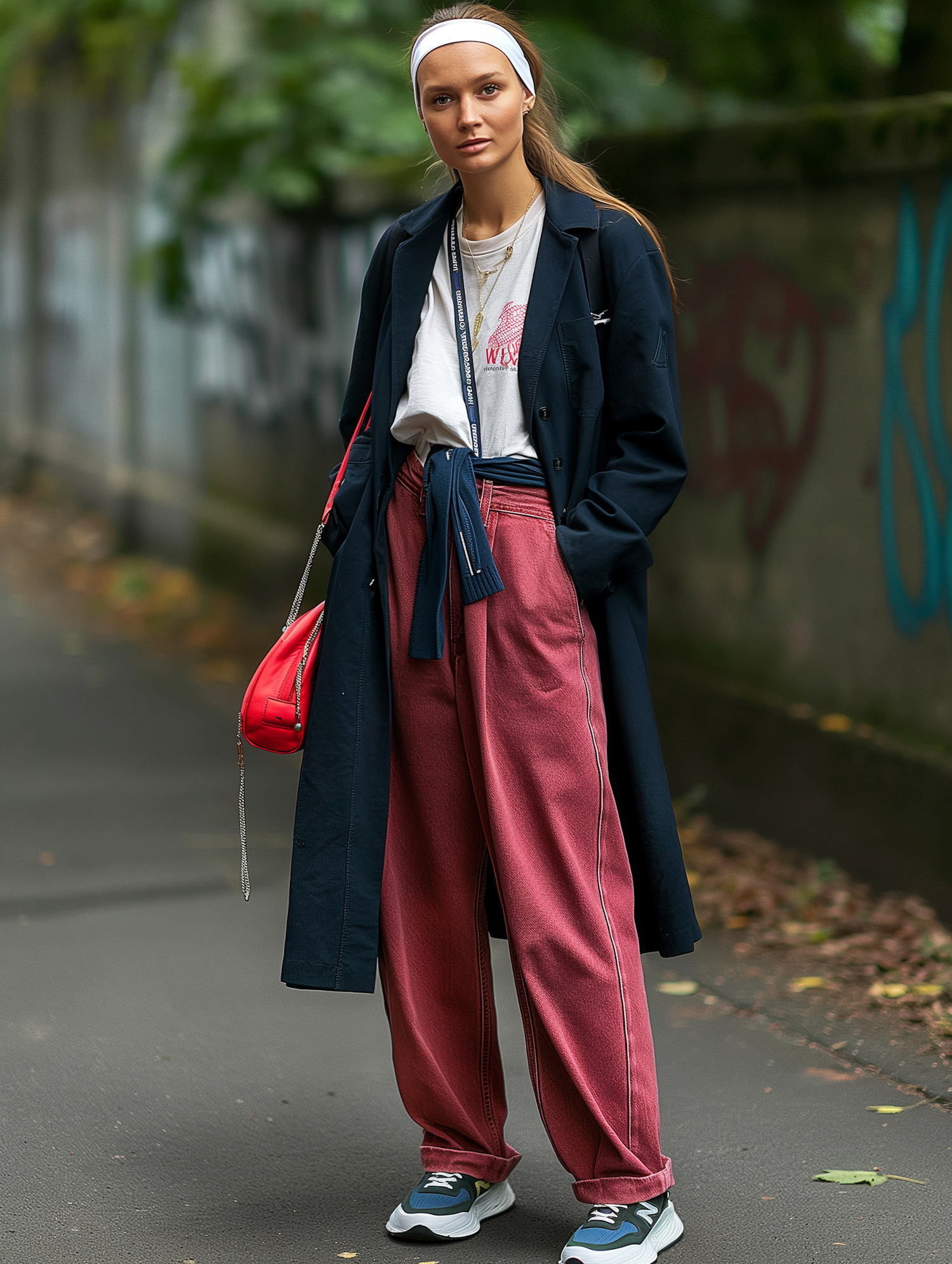 Stylish woman in a navy trench coat, pink trousers, and red bag, posing outdoors with a graffiti wall and trees in the background.