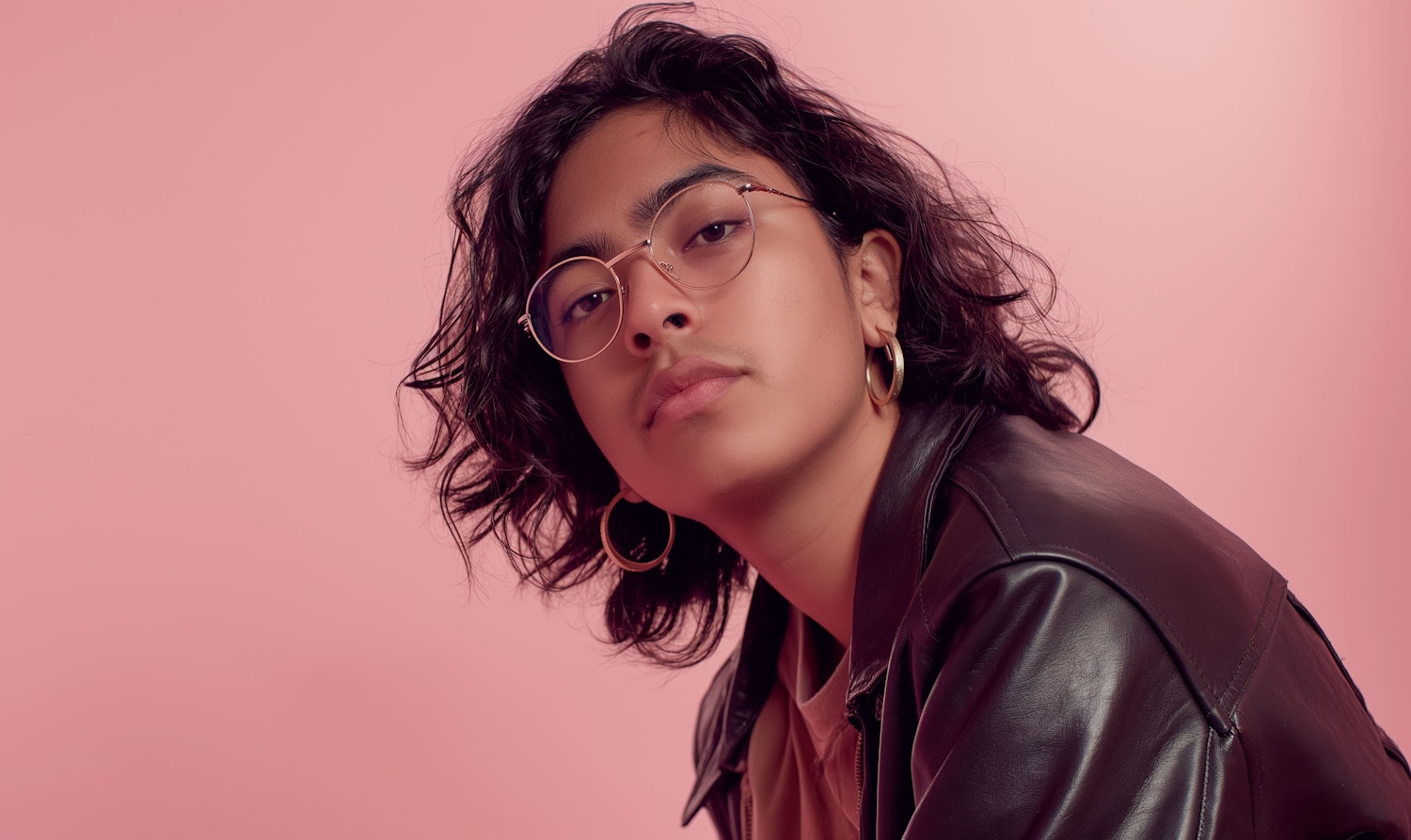Stylish portrait of a person with round glasses and hoop earrings against a pink background, wearing a leather jacket.