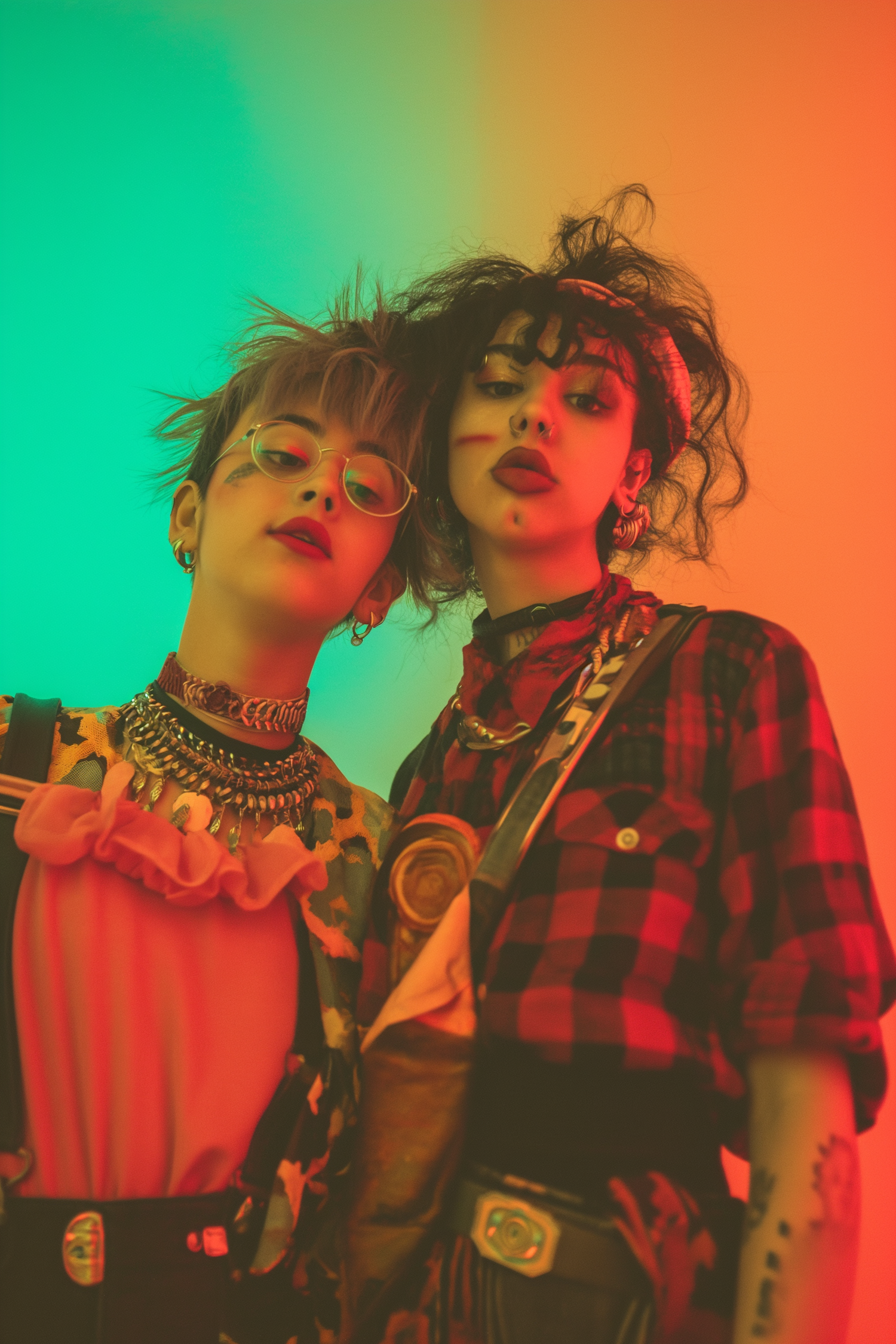 Two stylish individuals with bold makeup and eclectic outfits pose against a vibrant green and orange background.