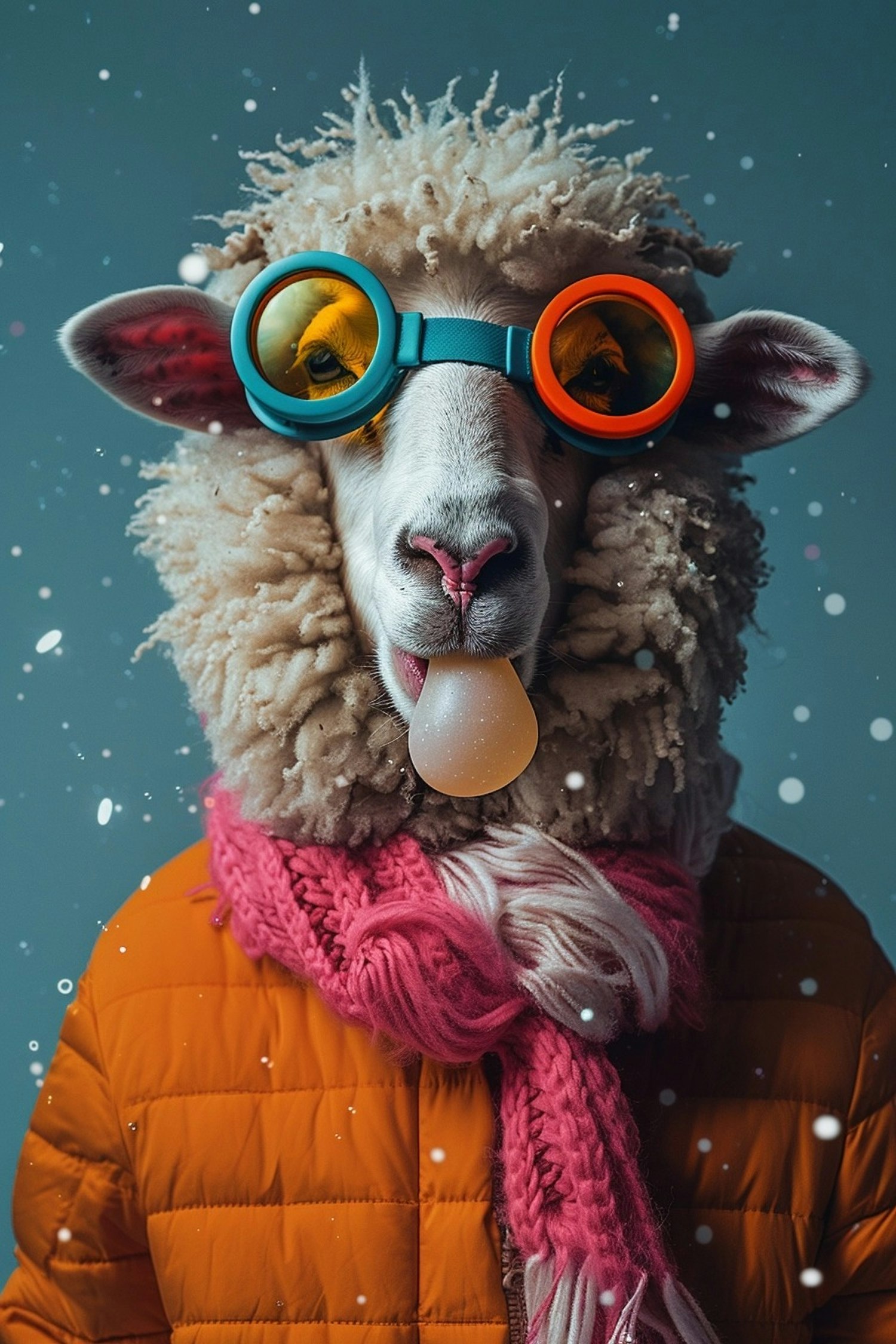 A quirky sheep in goggles, orange jacket, and pink scarf catches snowflakes on its tongue in a snowy, whimsical winter setting.