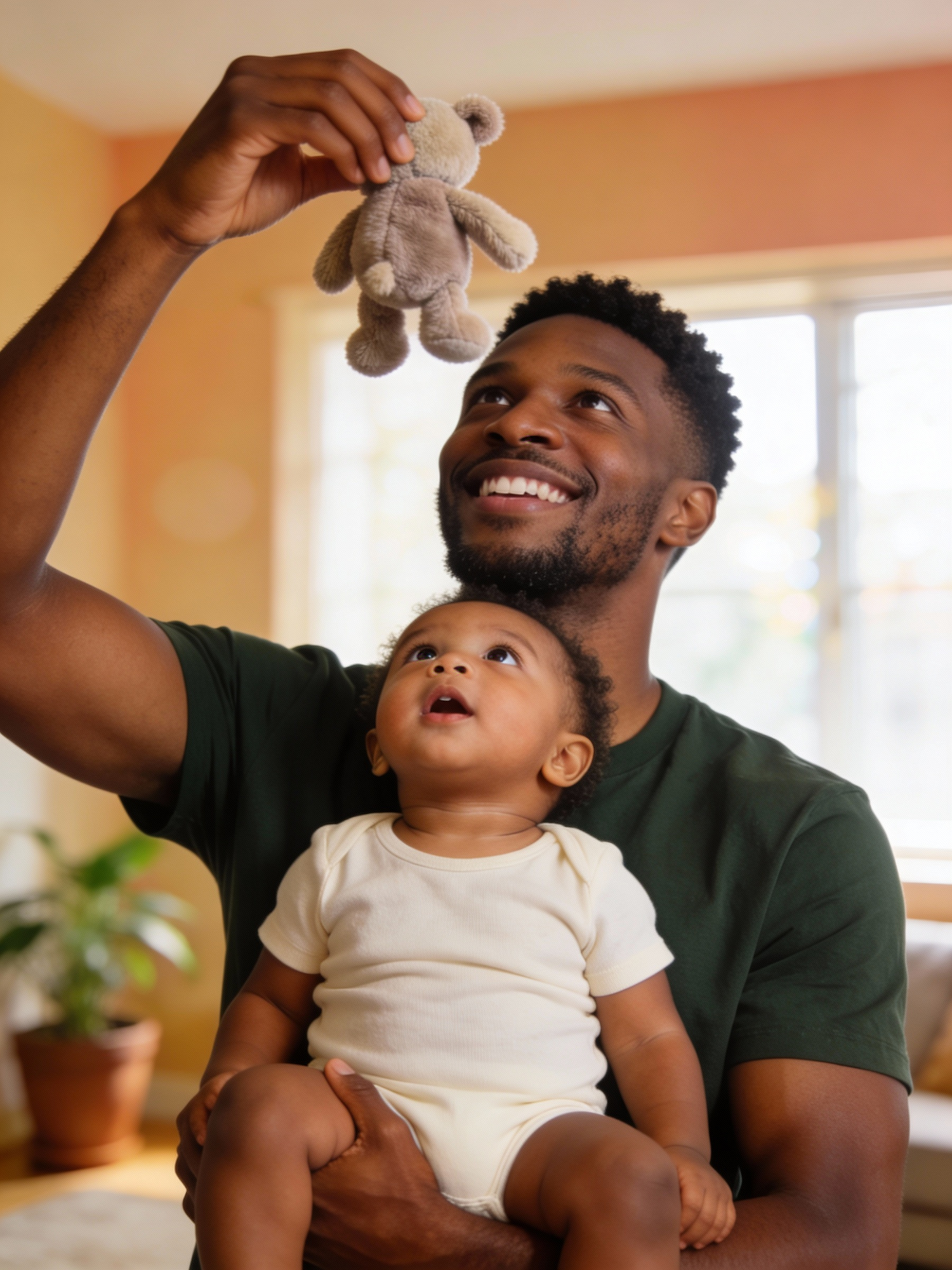 Studio portrait at home of a Nigerian male father in his early 30s playing with his nigerian baby; deep brown skin, warm undertone; short tight curls, neatly shaped; trimmed beard; simple dark green t-shirt, no logos. He holds his 6–8-month-old baby in a cream-colored onesie seated on his forearm at chest height, only the upper body visible; with his other hand he lifts a small soft plush toy with muted colors above the baby’s head in a playful arc. Warm natural daylight from a window; shallow depth of field; background is a blurred living room with warm-toned walls and a potted plant, soft bokeh. The father looks up at the plush toy with a big, natural grin, clearly enjoying the moment; the baby looks up at the toy with an excited expression, mouth slightly open and eyes wide. Portrait orientation, 3:4 ratio, mid-chest-up composition; subjects centered, camera at adult eye level; full head and hair of the father and the baby’s head entirely inside the frame with a little space above; both shoulders and plush toy clearly visible.