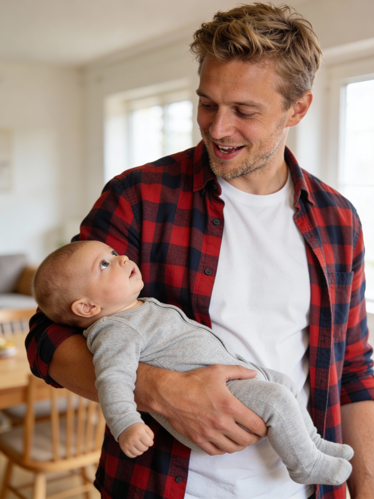 A man in a red checkered shirt holds a baby in a gray onesie, sharing a warm moment in a cozy, well-lit home setting.