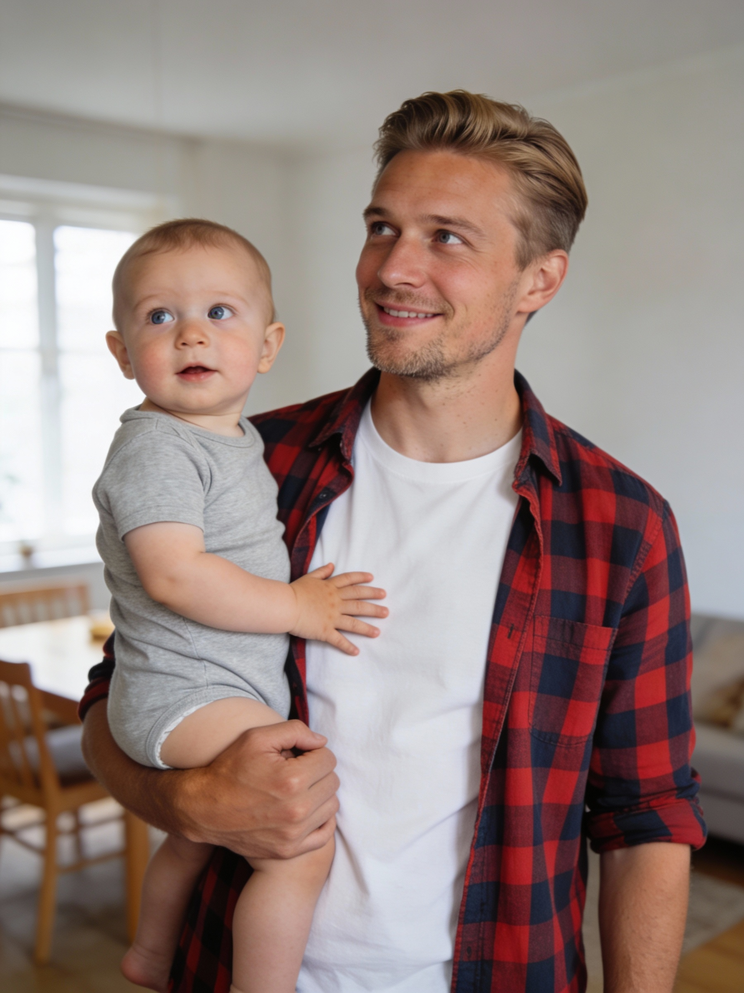 A man in a red checkered shirt holds a baby in a gray onesie, both looking upward with a warm and curious expression.