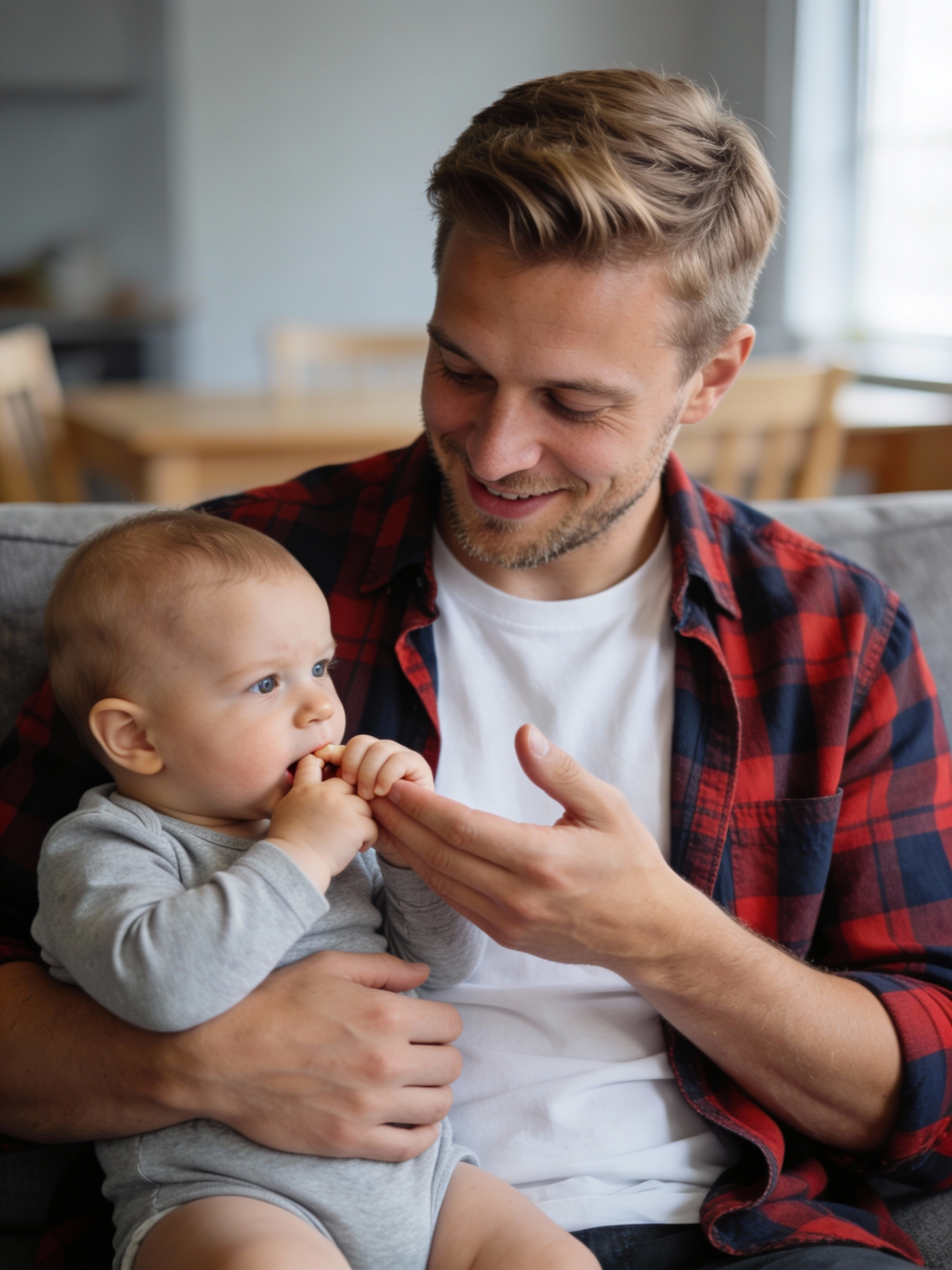 Studio portrait at home of a German male father in his mid 30s holding his baby close; fair skin, cool undertone; short light brown hair, neatly styled; light stubble; white t-shirt under an open red-and-navy flannel shirt, no logos. He sits on a sofa with his 8-10-month-old baby in a light gray onesie on his lap facing him, only the baby’s upper body visible. One of his hands is gently offered to the baby at chest height, and the baby holds his hand with both of theirs, gently chewing on his index finger in a teething way. Soft window light from the side; shallow depth of field; background is a blurred living or dining area with light wood furniture and neutral walls, natural bokeh. The father looks down at the baby’s face with a soft, amused smile and slightly raised eyebrows; the baby looks at his hand with serious concentration, mouth around the finger. Portrait orientation, 3:4 ratio, mid-chest-up composition; subjects centered, camera at eye level; full head and hair of the father and baby’s head fully inside the frame with a little space above; both shoulders and their hands clearly visible, no cropping at the top or sides.