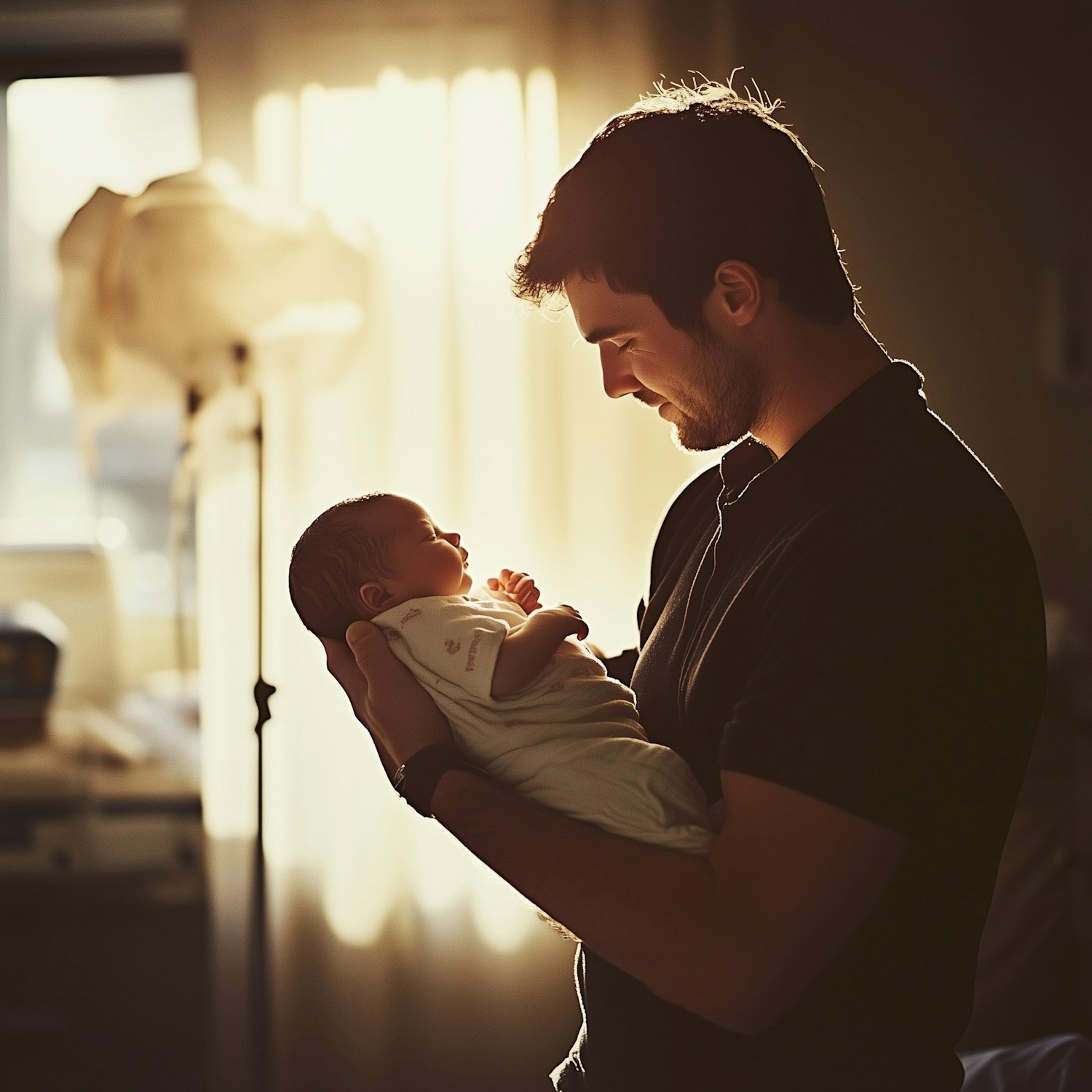 A father lovingly cradles his newborn in warm sunlight, creating a serene and intimate moment filled with tenderness.