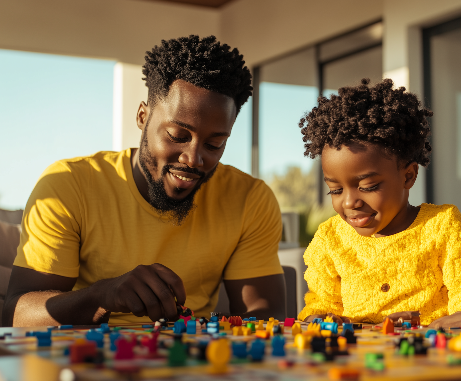 Father and son bonding over a board game, both wearing yellow, in a sunlit room. Joyful expressions and colorful game pieces.