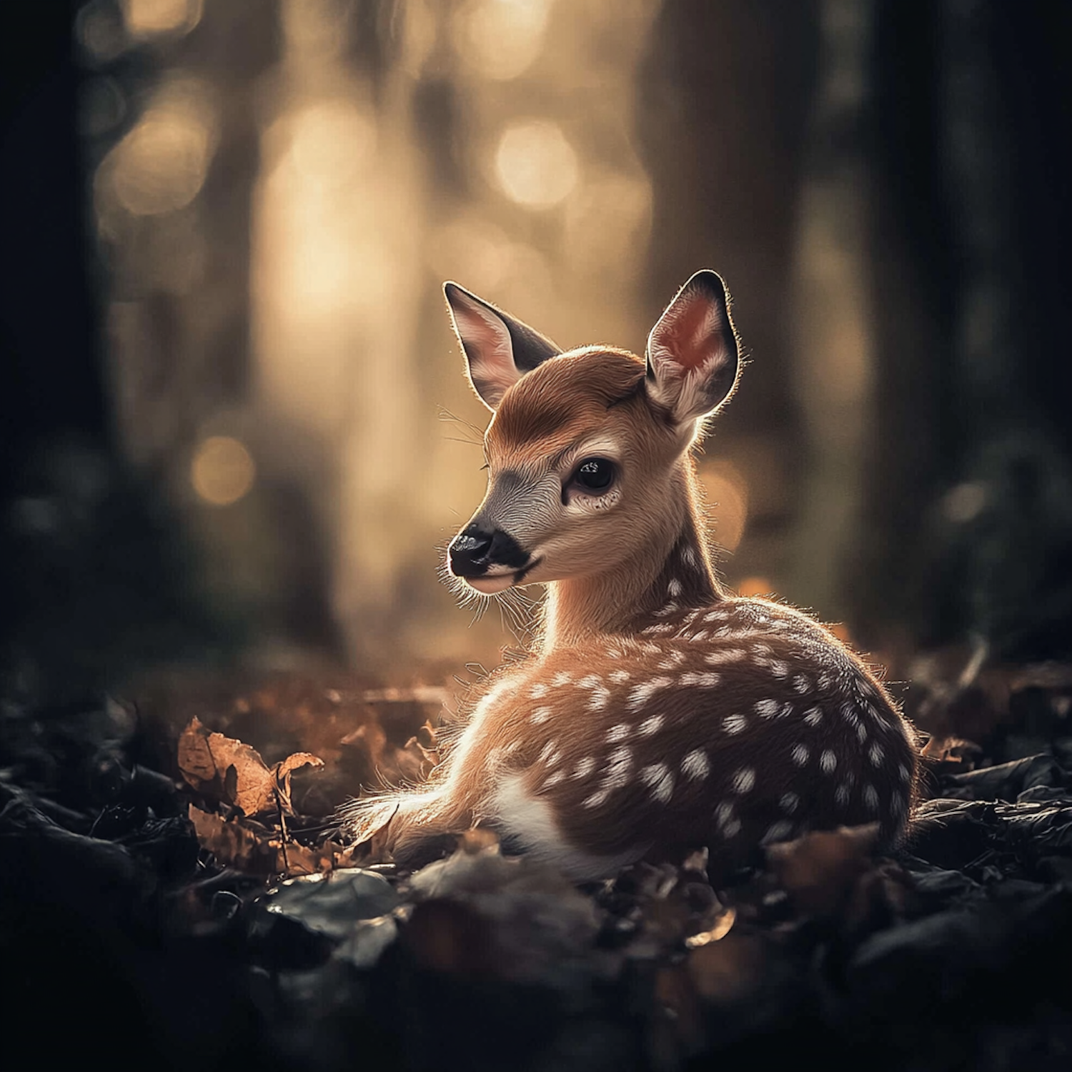 A serene scene of a young fawn resting in a sunlit forest, surrounded by dry leaves and soft, golden light.