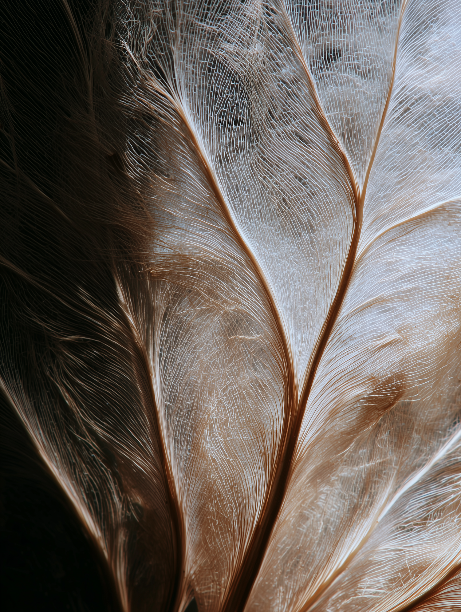 Close-up of a feather's intricate structure, showcasing its delicate fibers and natural patterns in warm brown and creamy white tones.
