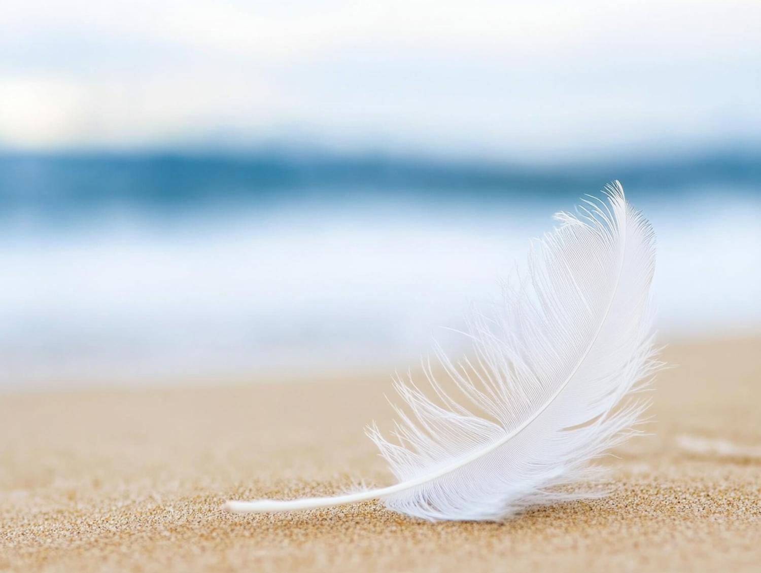 A delicate white feather on a sandy beach with a blurred ocean background, capturing tranquility and simplicity in nature.