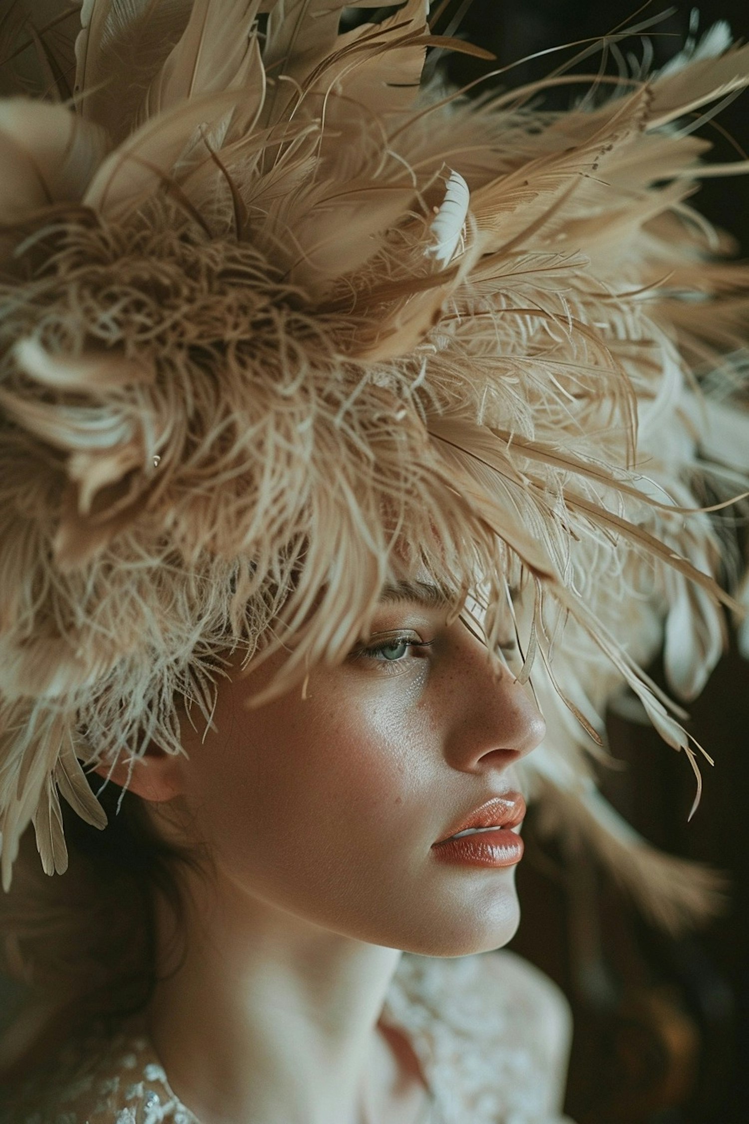 Close-up of a woman with a feathered headpiece, fair skin, and blue eyes, creating a dramatic and artistic look.
