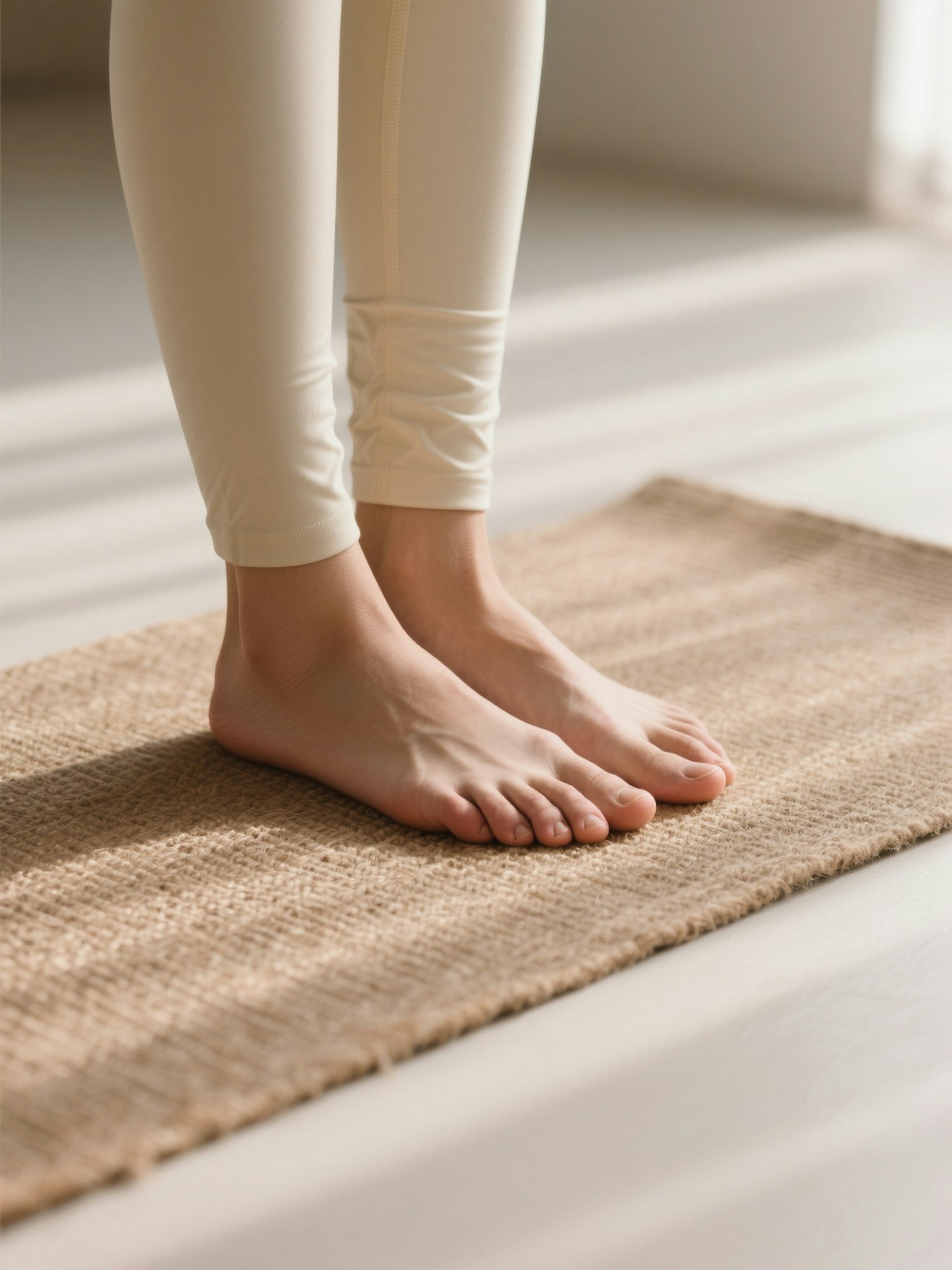 Minimalist, aesthetic editorial photography, soft neutral tones such as cream, beige, taupe, and warm browns, clean uncluttered background, gentle diffused natural light with soft shadows, smooth even contrast, realistic skin and fabric textures, high resolution, crisp focus, luxury lifestyle yoga campaign look — close-up of woman’s feet on a natural fiber yoga mat, cream leggings slightly wrinkled at the ankle, soft sunlight and shadow details