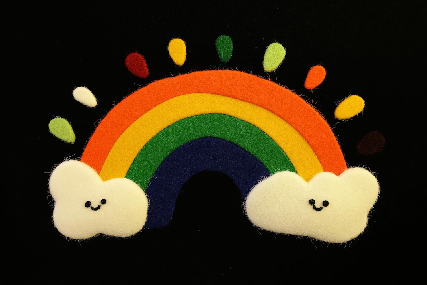 Cheerful felt rainbow with smiling clouds and colorful droplets on a black background. Perfect for kids' crafts or playful decor.