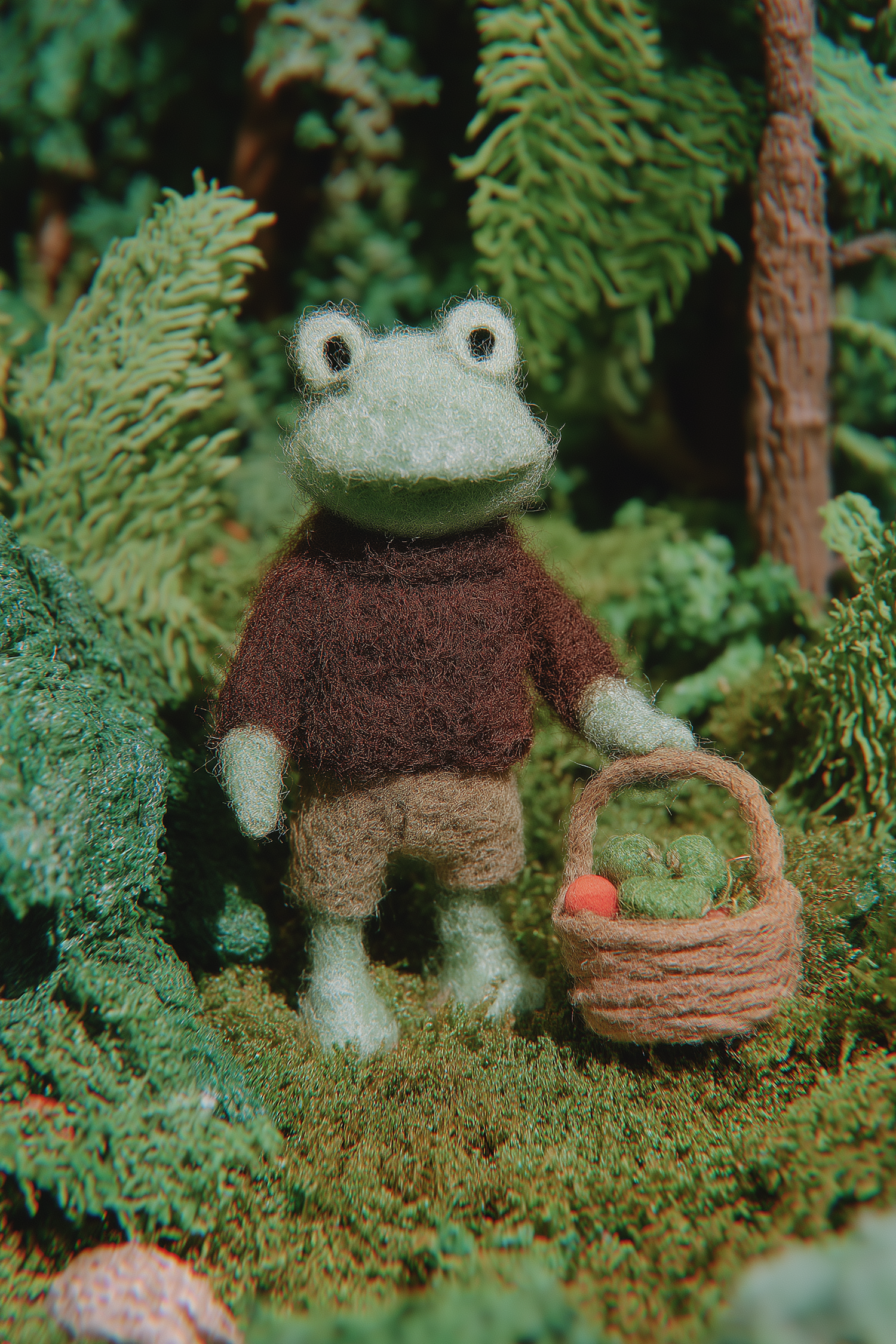 A felted wool frog figurine in a forest diorama, holding a basket of felted fruits and vegetables. Whimsical and detailed craftwork.