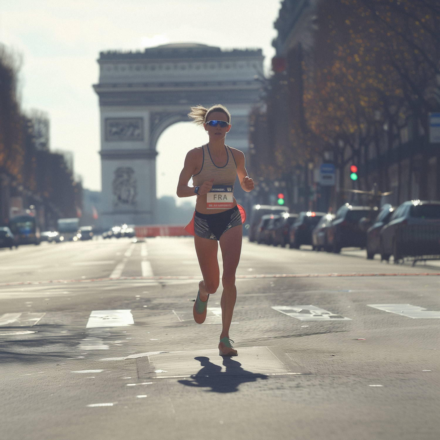 Female runner in Paris with Arc de Triomphe in background, wearing sunglasses and race bib 'FRA'.