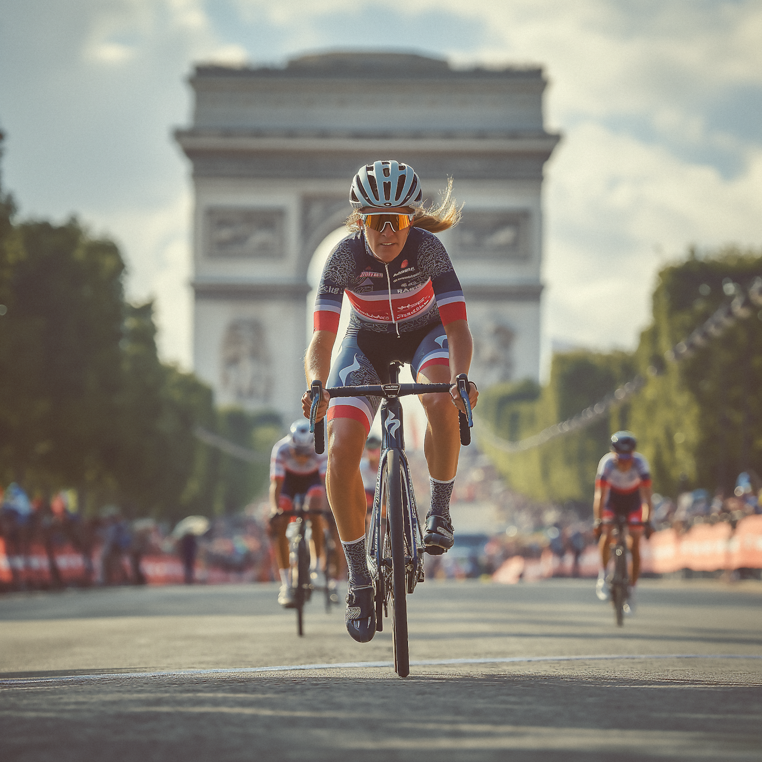 Cyclist races past the Arc de Triomphe, showcasing speed and determination in a vibrant, sunlit setting.