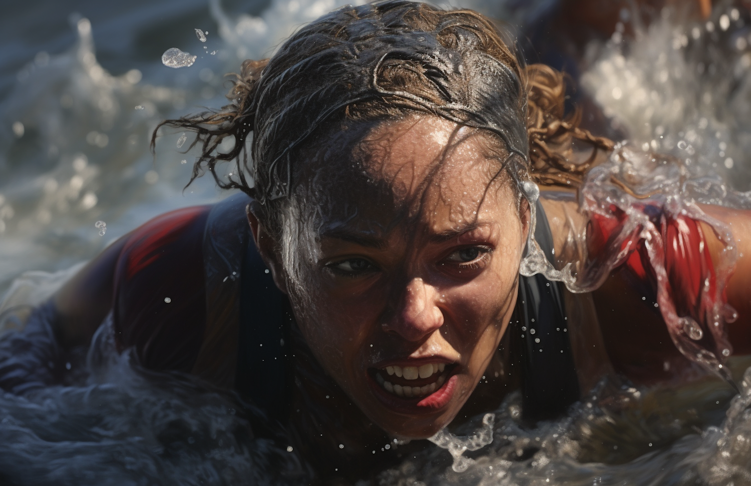 Intense moment of a determined woman emerging from water, showcasing strength and focus with dynamic splashes and sunlight highlights.