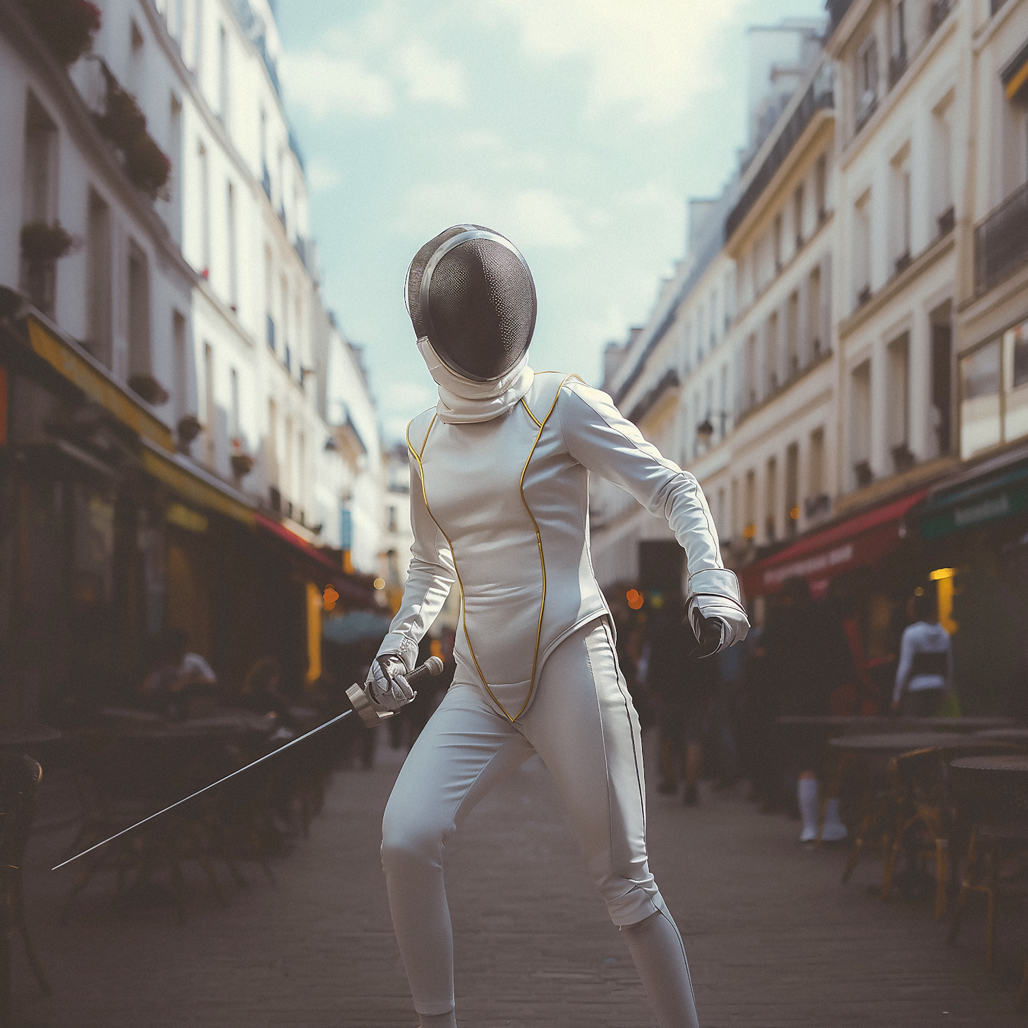 Fencer in full gear stands poised on a European street, surrounded by cafes and classic architecture, under a clear sky.