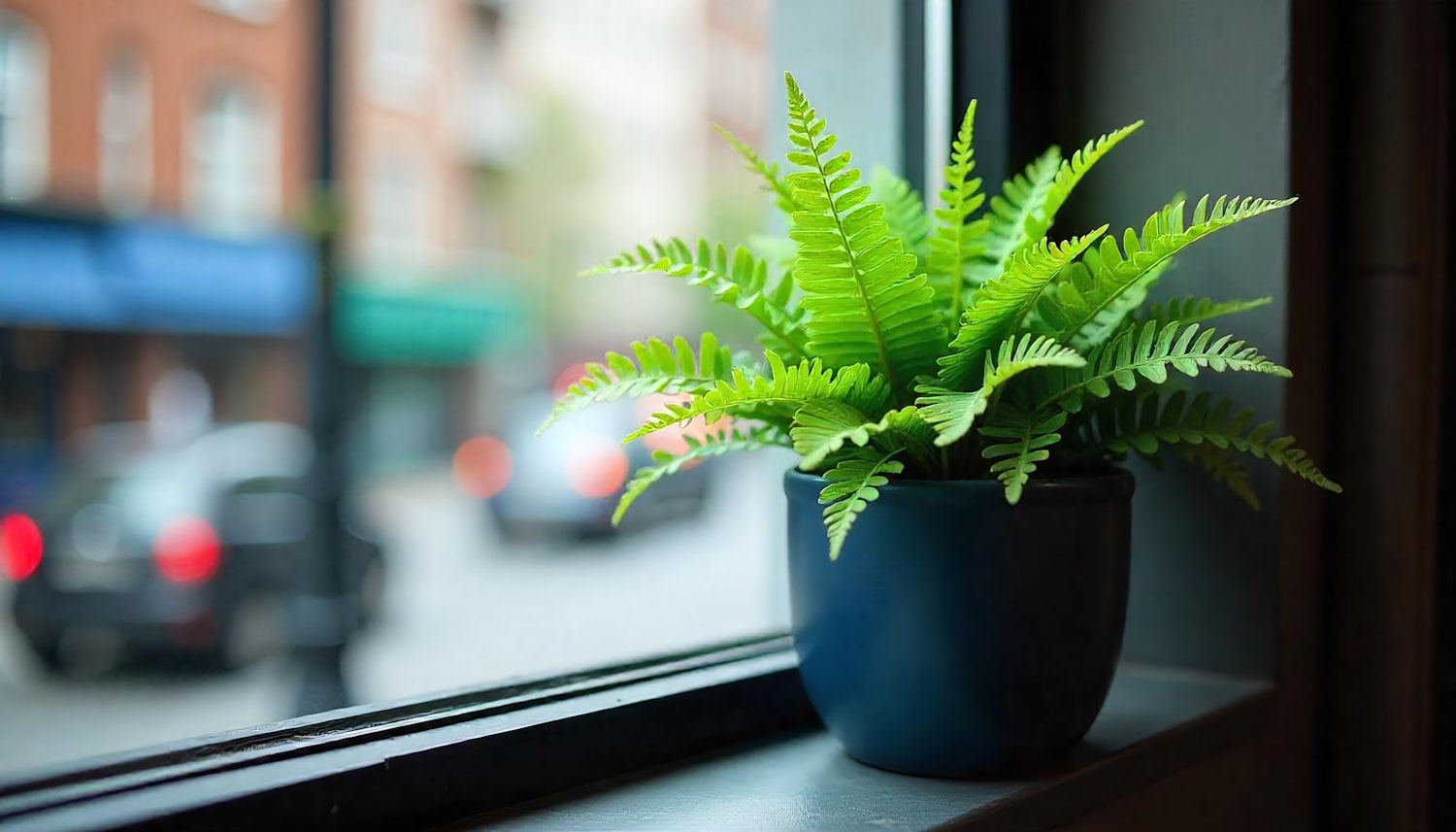A lush green fern in a blue pot on a windowsill with a blurred city street in the background.