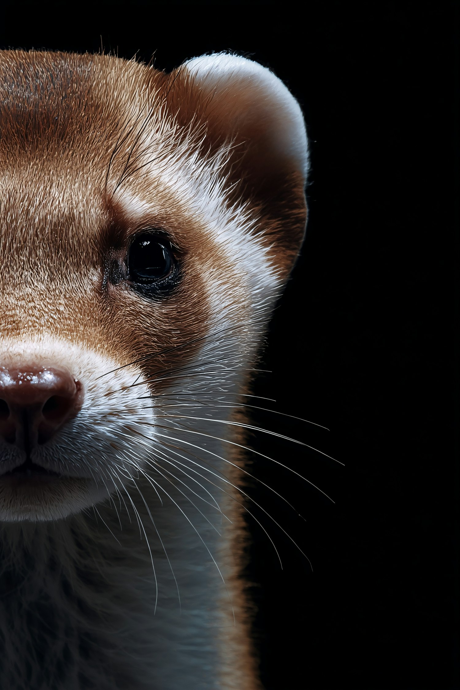Close-up of a ferret's face with detailed fur and whiskers against a black background, highlighting its expressive features.