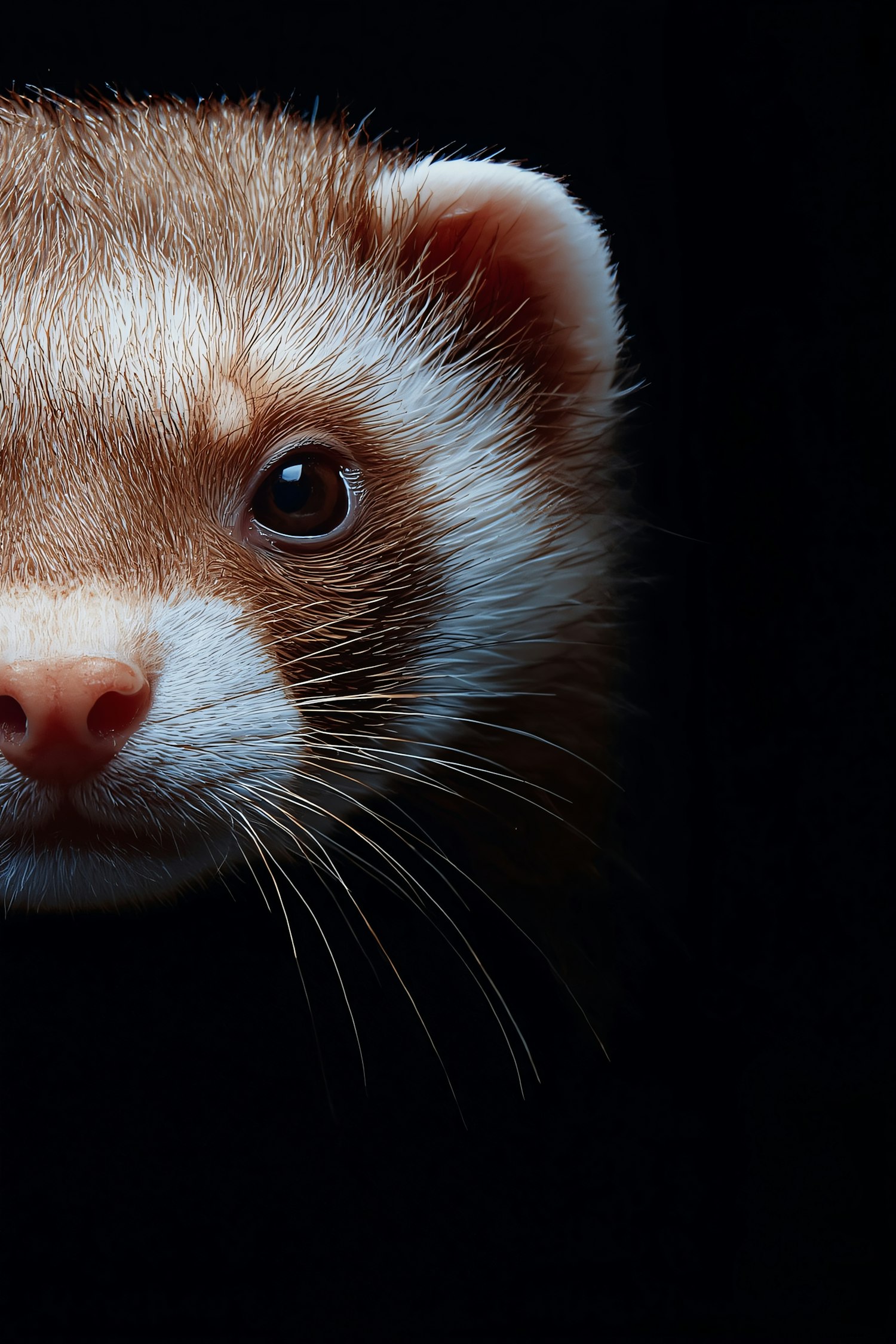 Close-up of a ferret's face with detailed fur and expressive eyes against a dark background.