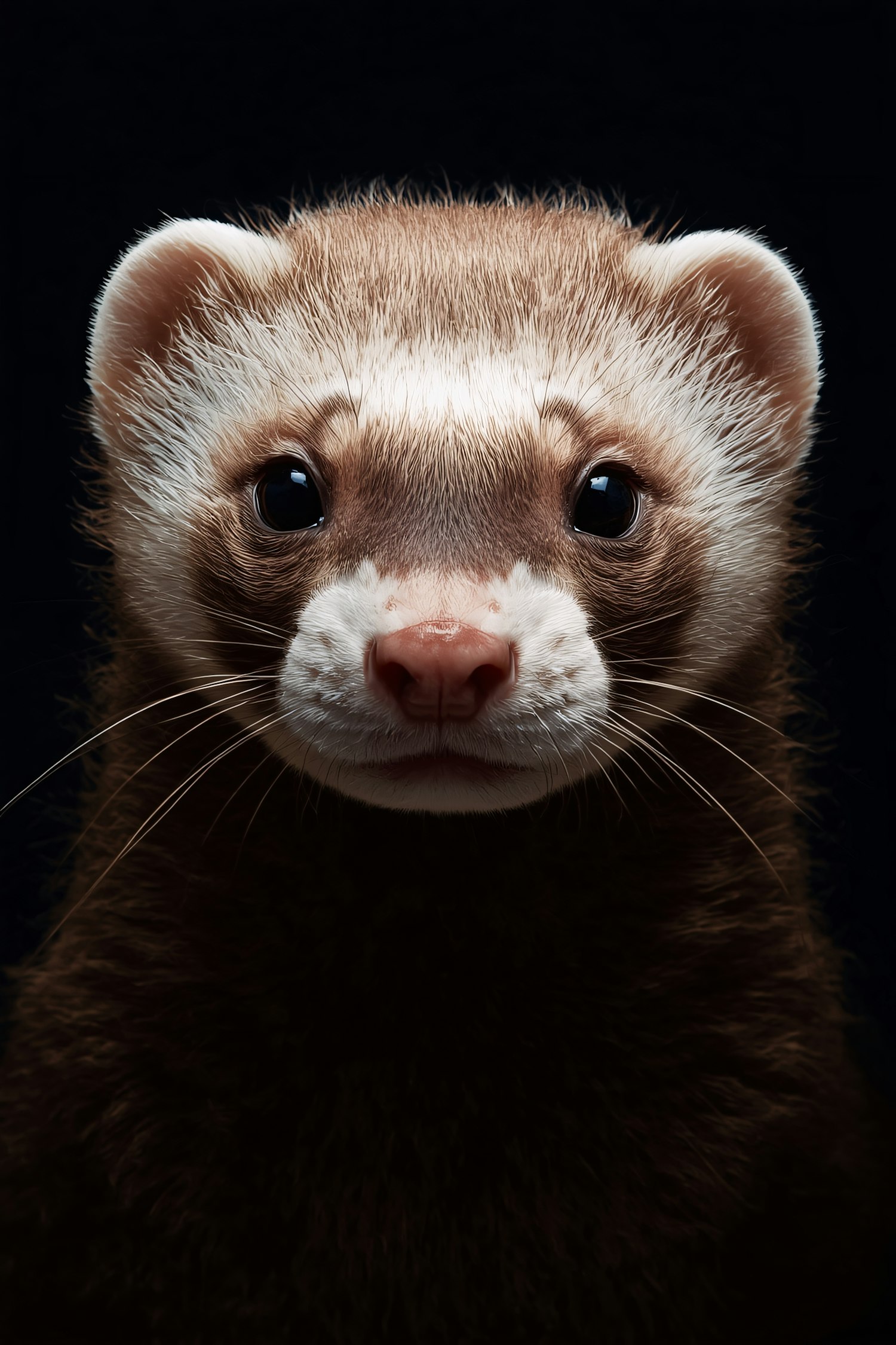 Close-up of a ferret with detailed fur and expressive eyes, set against a dark background for a striking contrast.