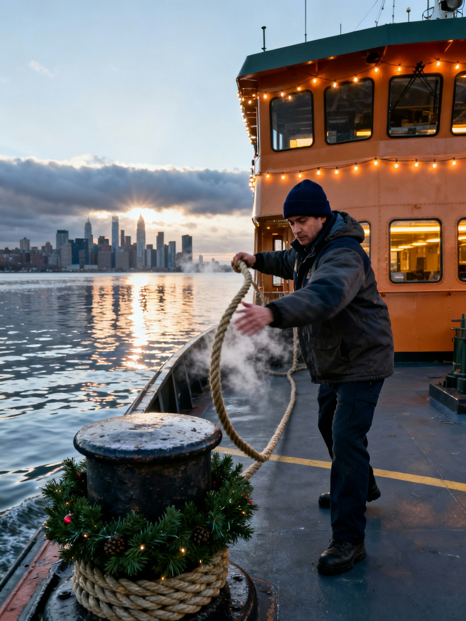 Commuter ferry dock (urban river) Rope bollards wrapped with garland; deckhand in wool cap tossing a line, faint motion in hands; string-lit ferry cabin; rippled water realistically reflecting skyline and sun break under the cloud shelf; breath vapor visible. 24 mm, f/7.1, ISO 100, 1/250 s; CPL to cut glare. Negative: mirror-perfect water, neon color shifts, edge halos.